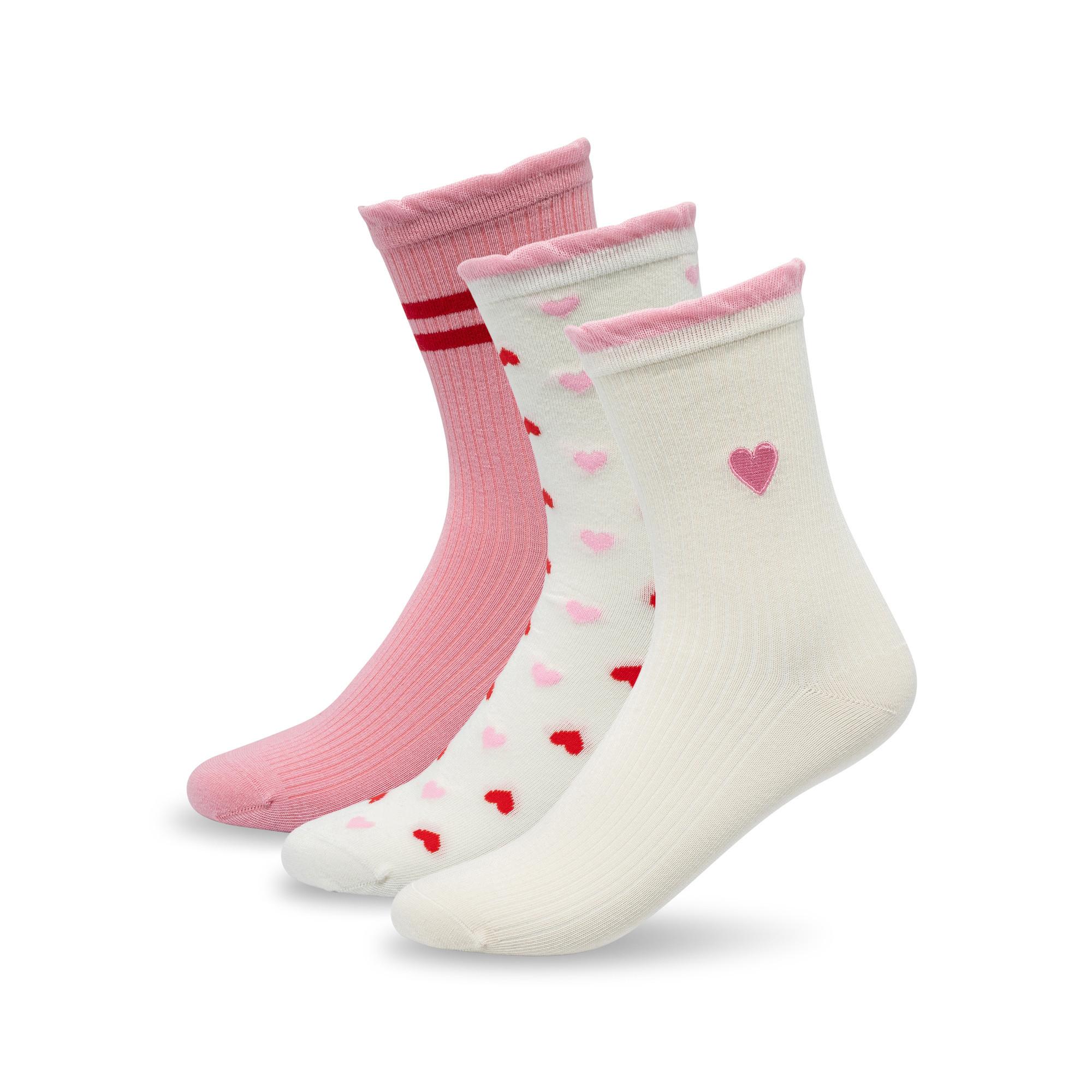 Dieses 3er-Pack Waden Socken bietet eine reizvolle Auswahl an Designs, perfekt, um jedem Outfit einen Hauch von Charme zu verleihen. Das Set enthält ein Paar einfarbige rosa gerippte Socken mit zwei roten Streifen, ein Paar weisse Socken mit einem durchgehenden Herzmuster in Rosa und Rot und ein Paar weisse gerippte Socken mit einem einzelnen gestickten rosa Herz. Jedes Paar ist auf Komfort und Stil ausgelegt und macht sie zu einer vielseitigen Ergänzung für jede Garderobe.