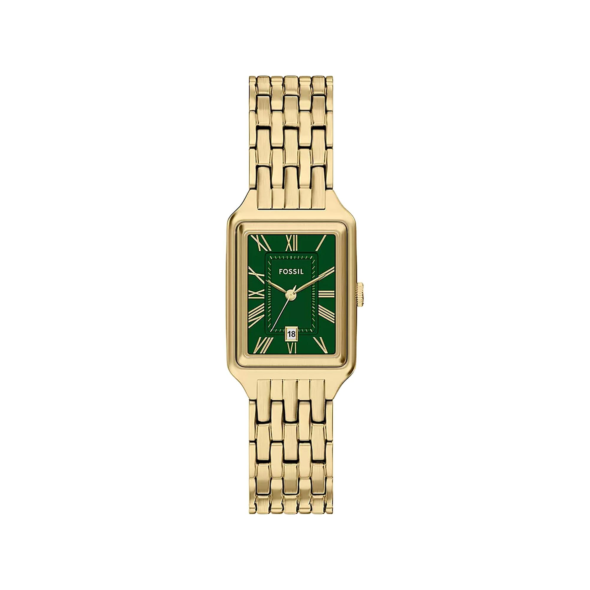 Das rechteckige, goldfarbene Edelstahlgehäuse geht nahtlos in das Band über und sorgt für ein elegantes, stimmiges Design. Das satingrüne Zifferblatt mit 3-Zeiger-Anzeige und Datumsfenster setzt einen raffinierten Farbakzent, während die Faltschliesse mit zwei Drückern für sicheren und bequemen Halt sorgt.