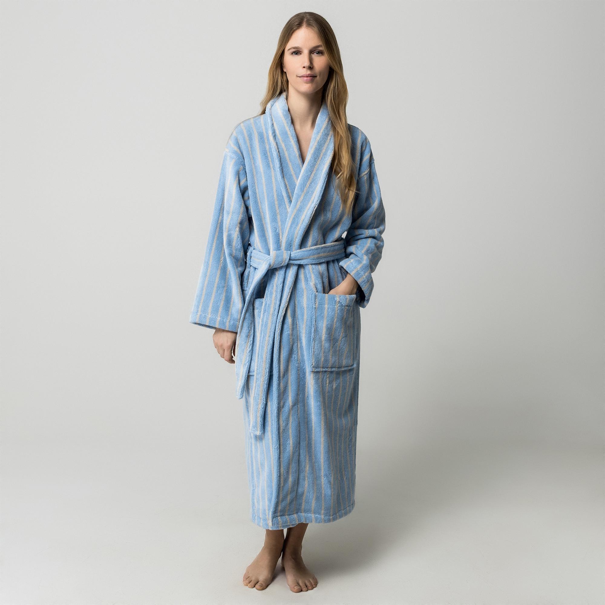 Dieser Unisex-Bademantel präsentiert sich in einem klassischen Streifendesign und bietet Komfort und Stil. Der Bademantel verfügt über einen Bindegürtel für eine verstellbare Passform.