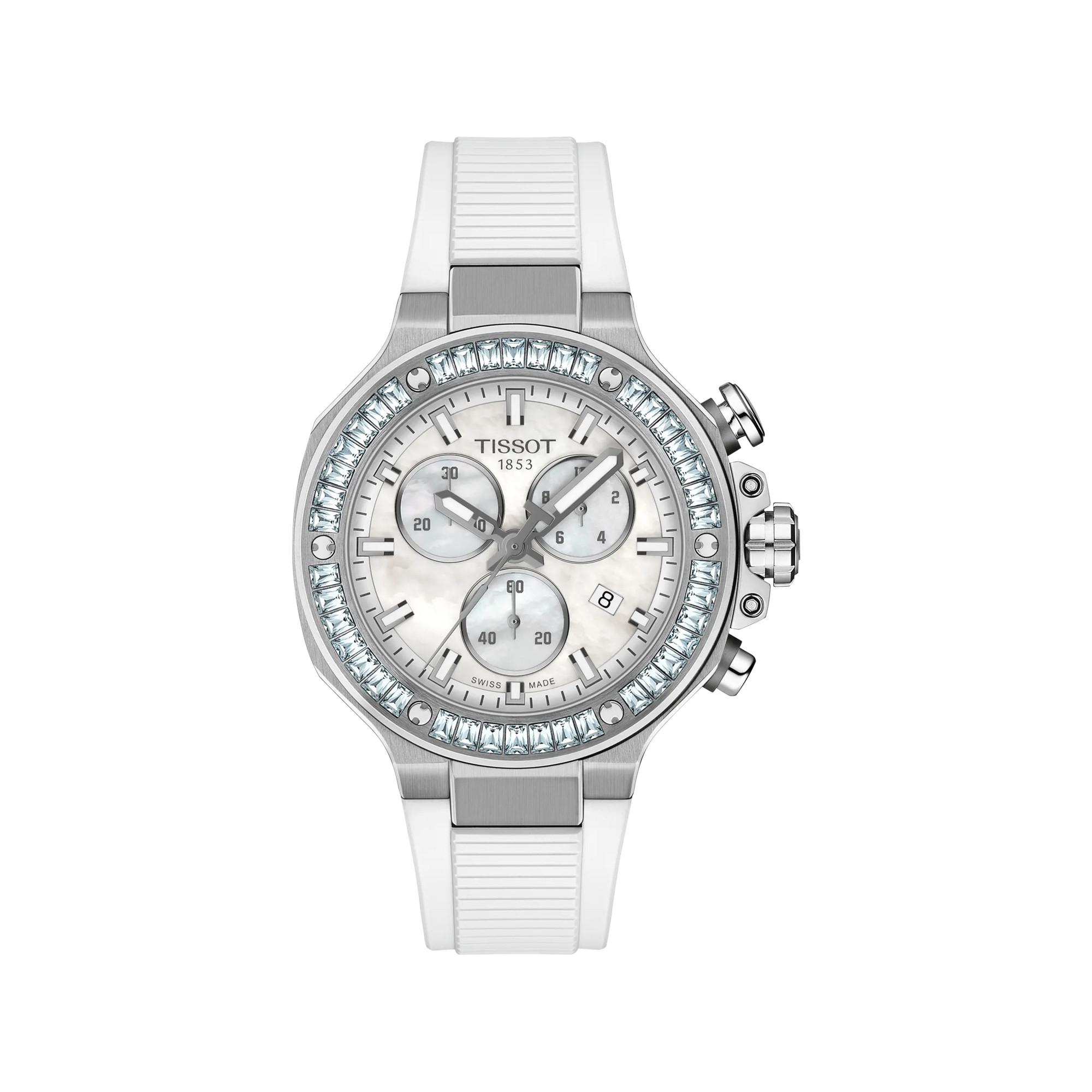 Die Tissot T-Race Chronograph 38 mm vereint Sportgeist und Präzision in einem markanten Design. Inspiriert vom Motorsport, besticht sie durch Details wie die bremsscheibenähnliche Lünette, lenkerförmige Drücker und ein robustes Edelstahlgehäuse – perfekt für Liebhaber dynamischer Eleganz.