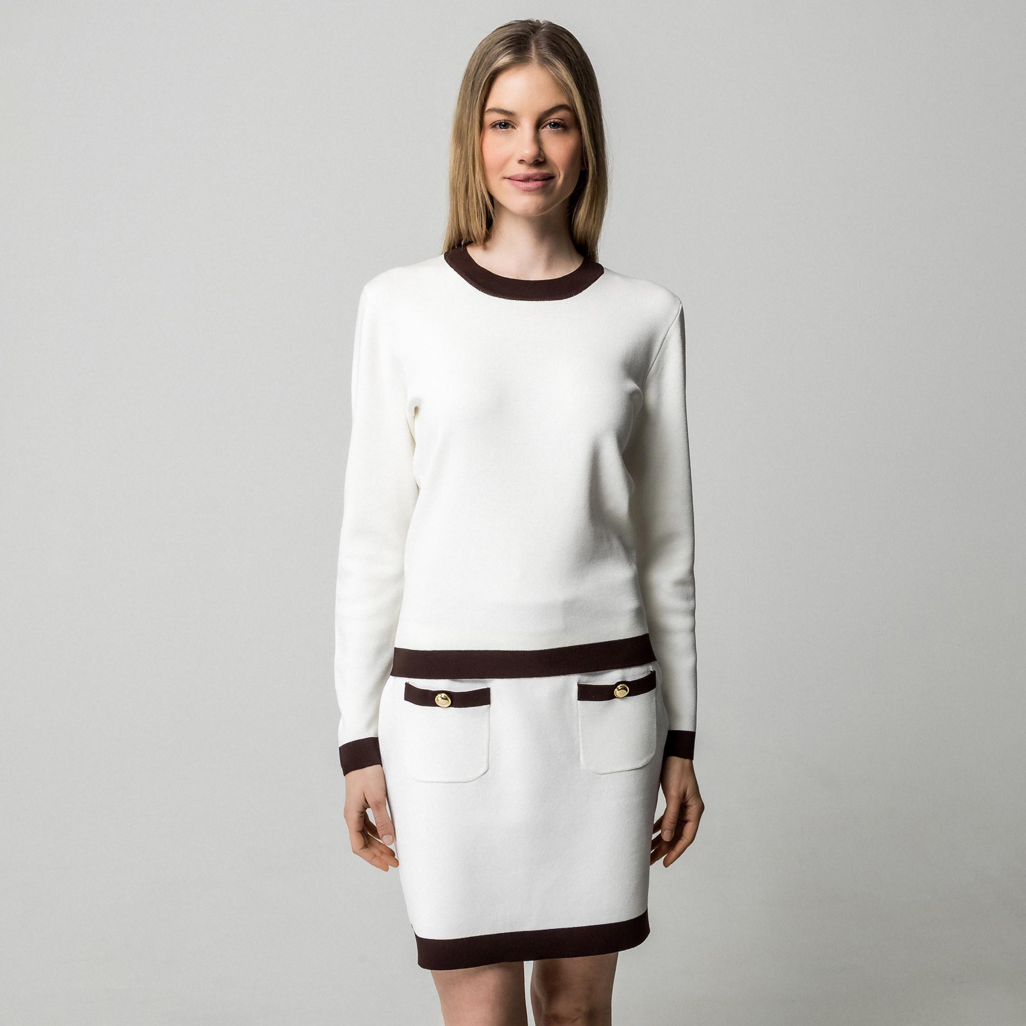 Dieser Minirock verfügt über einen schicken Kontrastbesatz am Saum und einen breiten Bund, der einen raffinierten und stimmigen Look schafft. Das Design umfasst zwei aufgesetzte Taschen auf der Vorderseite, die jeweils mit einem dekorativen goldfarbenen Knopf verziert sind und einen Hauch von Eleganz verleihen.