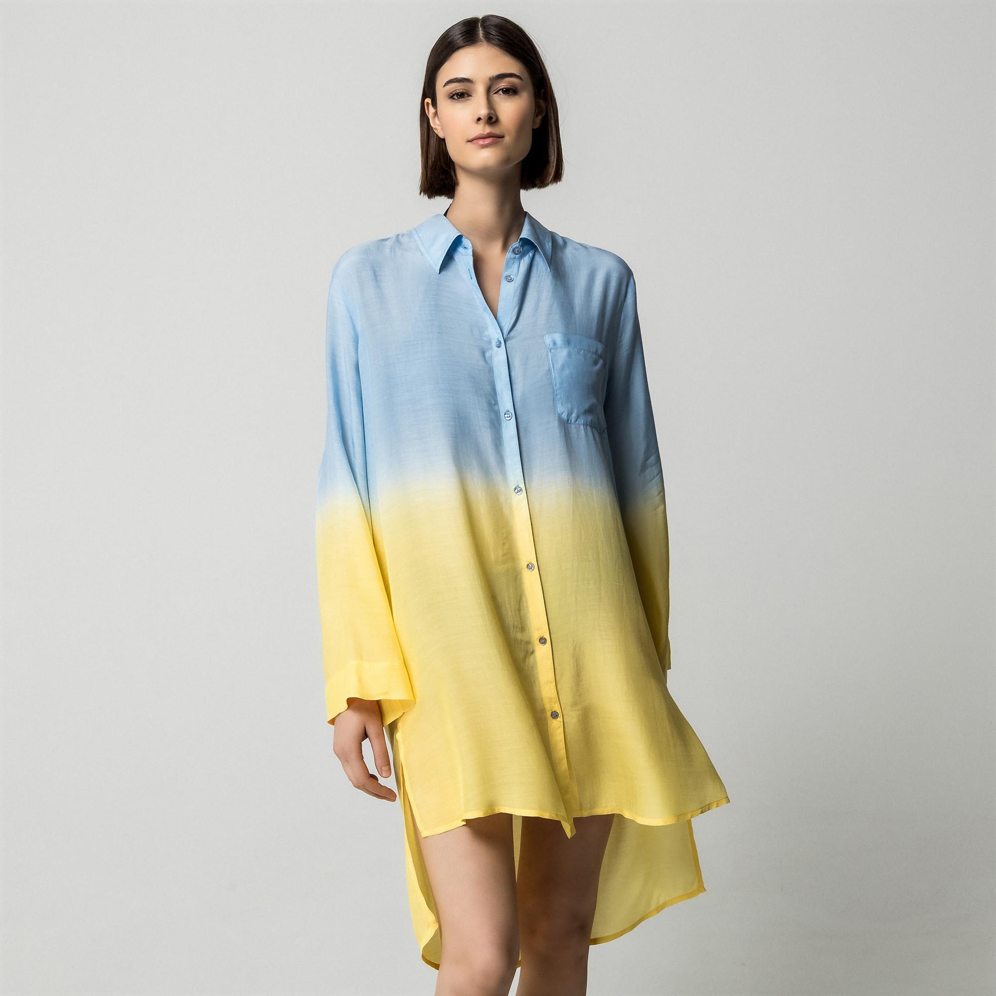 Dieses Tunikakleid präsentiert sich in einem stilvollen Ombre-Design, das von Blau zu Gelb übergeht. Es ist mit einem klassischen Hemdkragen und einer durchgehenden Knopfleiste für einen vielseitigen Look ausgestattet. Die langen Ärmel können hochgekrempelt und mit Knopfriegeln befestigt werden, was Anpassungsfähigkeit für verschiedene Stile und Temperaturen bietet. Eine einzelne Brusttasche ergänzt das Design um ein funktionales Detail. Das Kleid hat einen High-Low-Saum, der eine moderne Silhouette mit einer längeren Rückseite schafft.