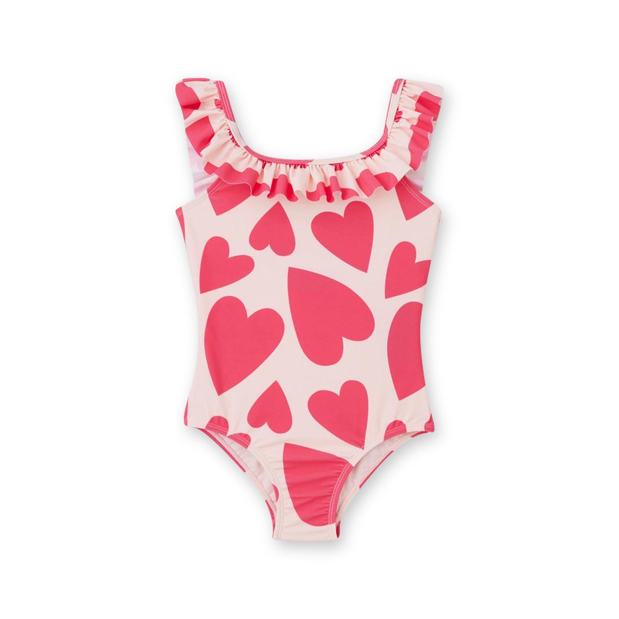 Der Badeanzug von Tao Kids überzeugt mit einem verspielten All-Over-Herz-Print und dekorativen Rüschen. Das ärmellose Design sorgt für Bewegungsfreiheit und einen bequemen Sitz beim Schwimmen oder Spielen am Wasser.