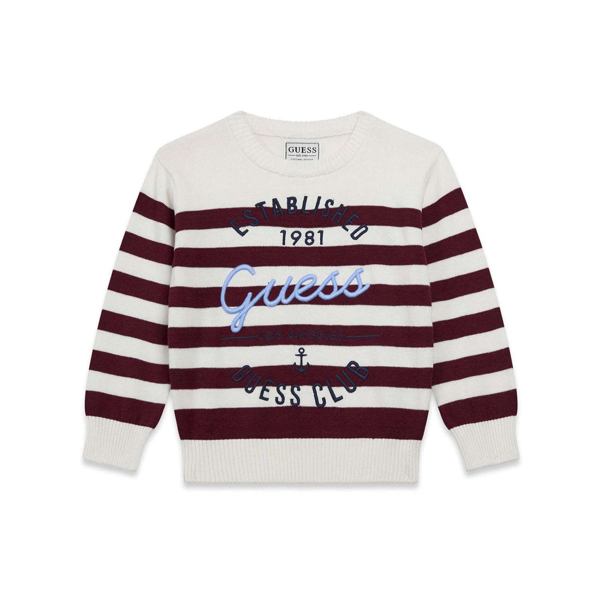 Das Guess Kids Sweatshirt überzeugt mit seinem modernen Streifen‑Design in Bordeaux und Creme sowie einem hochwertig gestickten Logo auf der Vorderseite. Der Regular Fit mit Rundhalsausschnitt und langen Ärmeln bietet optimale Bewegungsfreiheit, während die feinen Rippbündchen für Komfort und guten Sitz sorgen. Aus weicher Bio‑Baumwolle gefertigt, ist es atmungsaktiv, strapazierfähig und ideal für Schule, Freizeit und Alltag.
