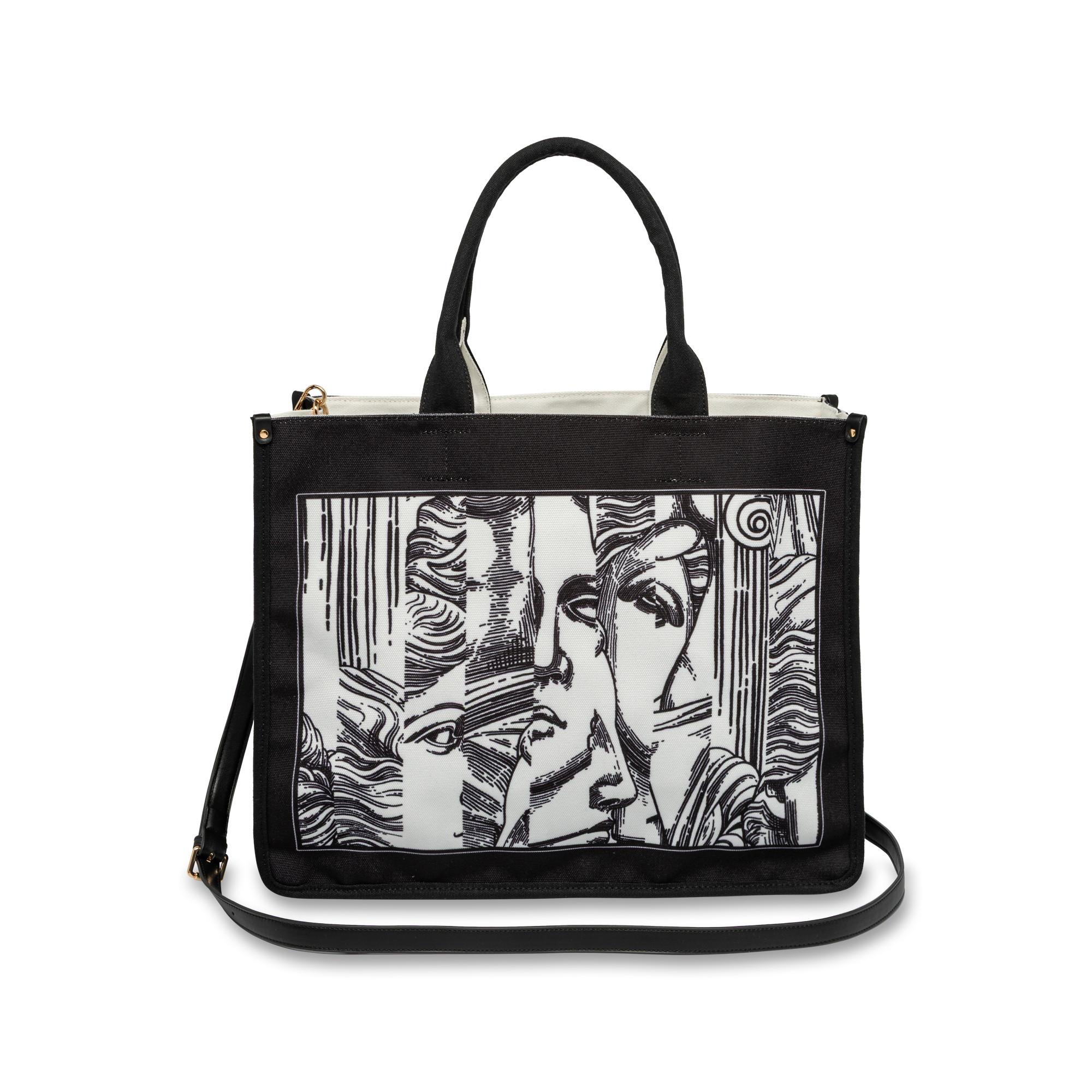 Diese Handtasche präsentiert sich mit einem auffälligen Druck auf der Vorderseite, der sie zu einem unverwechselbaren Accessoire macht. Das Design umfasst stabile Tragegriffe und einen abnehmbaren Schultergurt, der vielseitige Tragemöglichkeiten bietet. Das geräumige Innere ist mit einem Reissverschluss gesichert und verfügt über eine Innentasche zur Organisation kleinerer Gegenstände.