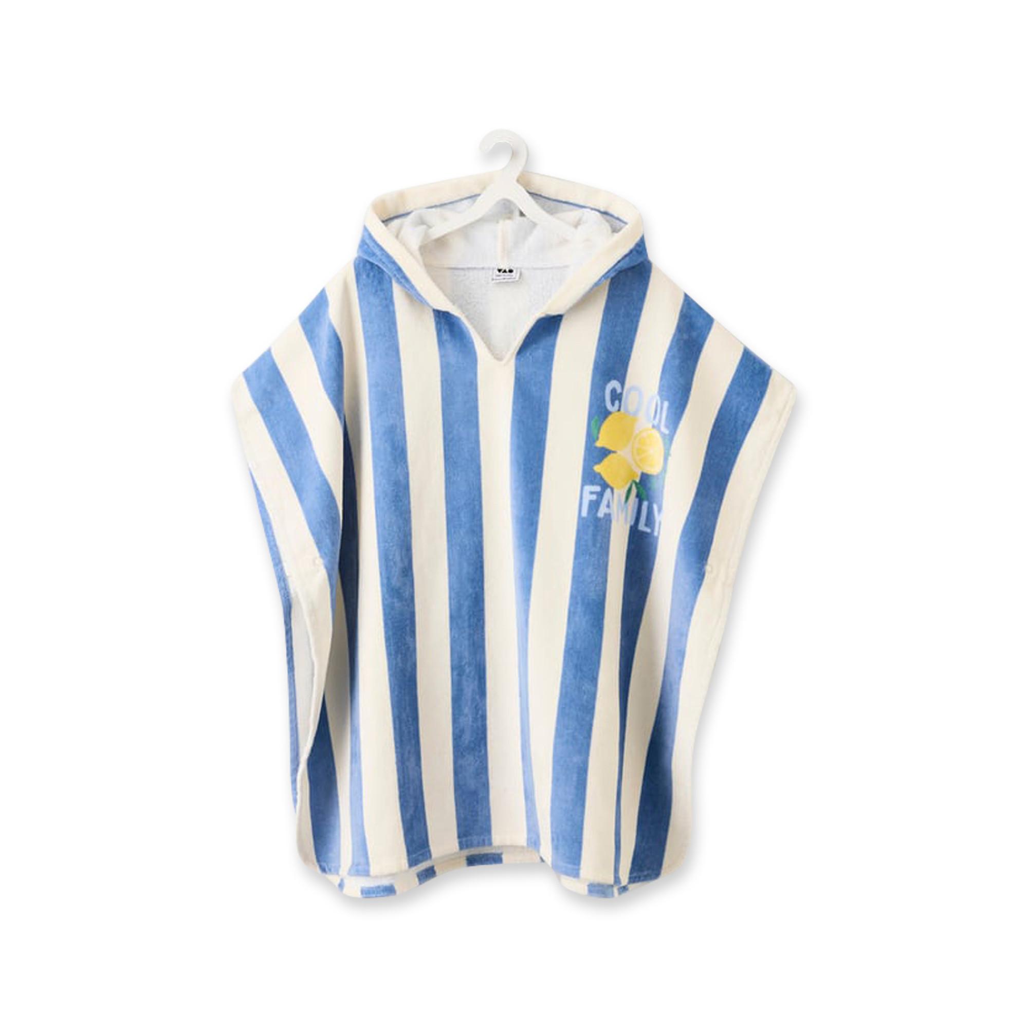 Dieser Kinderponcho ist ideal für sonnige Tage am Strand oder am Pool. Das blau-weiss gestreifte Design mit maritimem Charme wird durch einen verspielten Zitronenprint und den Schriftzug «Cool Family» ergänzt. Die praktische Kapuze schützt zuverlässig vor Wind, während der lockere Schnitt für angenehmen Tragekomfort sorgt. Ein unkompliziertes Lieblingsstück für sommerliche Familienabenteuer.