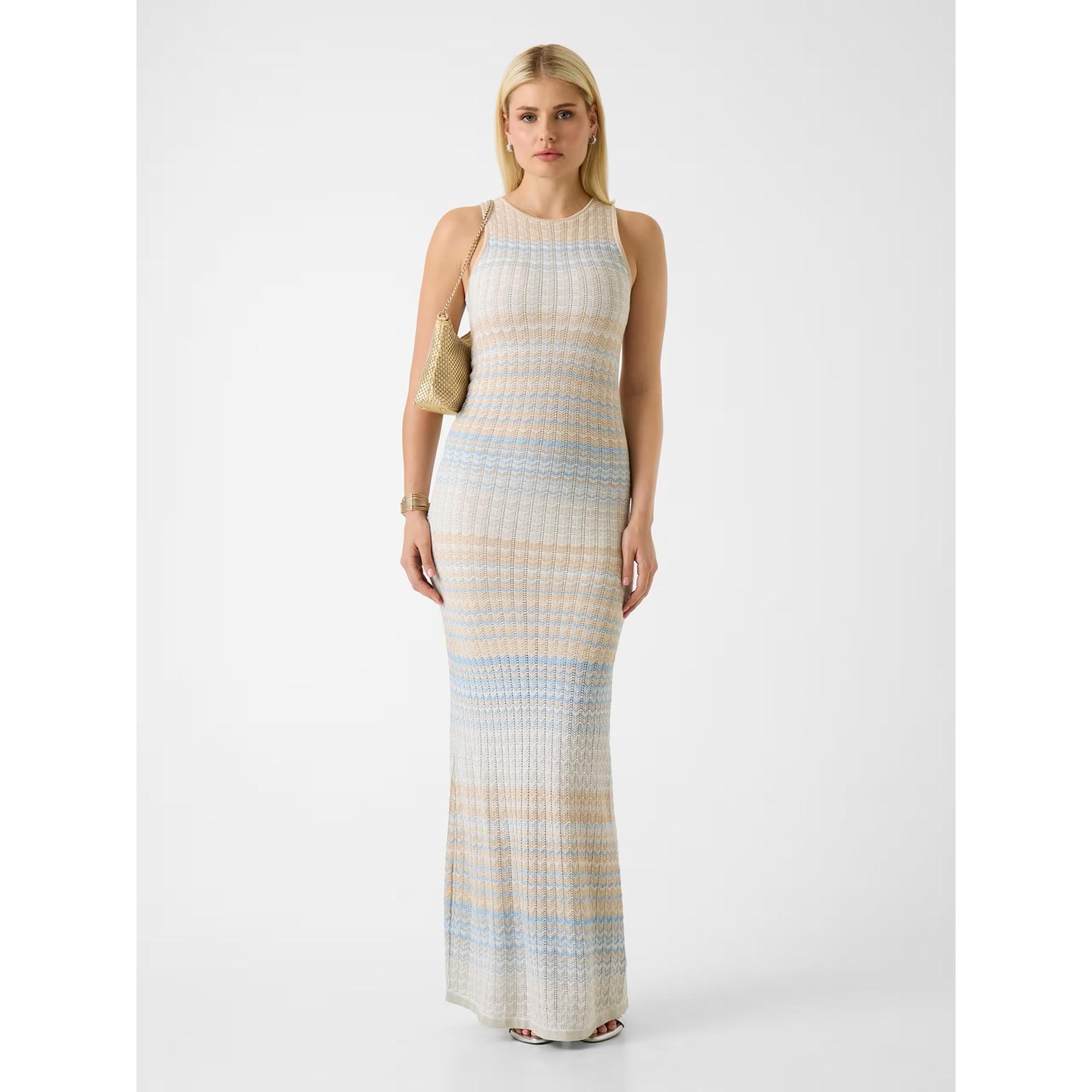 Dieses Maxikleid verfügt über ein ärmelloses Design und einen Rundhalsausschnitt, was eine klassische und bequeme Passform bietet. Das Kleid ist mit einem lebhaften Streifenmuster verziert, das dem gesamten Look eine verspielte und stilvolle Note verleiht. Es ist als vielseitiges Kleidungsstück konzipiert, das für verschiedene Anlässe geeignet ist.