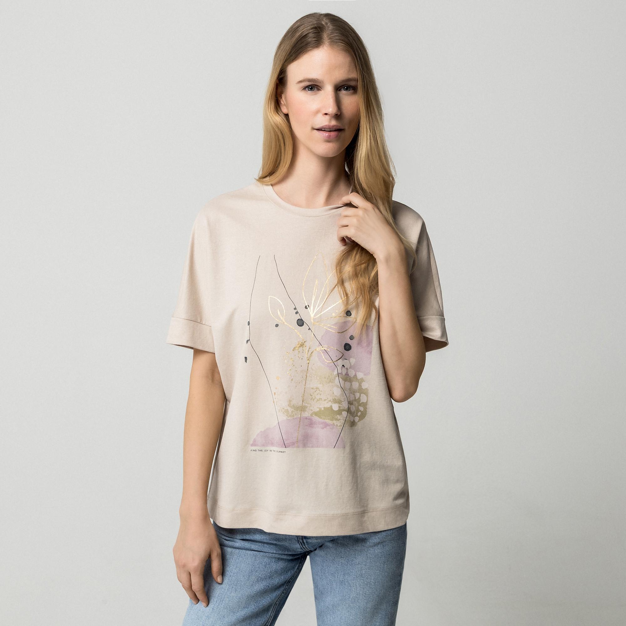 Dieses T-Shirt verfügt über eine entspannte Passform und einen Rundhalsausschnitt, was es zu einer bequemen und vielseitigen Option für den Alltag macht. Die kurzen Ärmel sind mit einem umgeschlagenen Bündchen versehen, das dem Gesamtbild eine lässige Note verleiht. Ein abstrakter Print ziert die Vorderseite und sorgt für eine moderne und künstlerische Ästhetik.