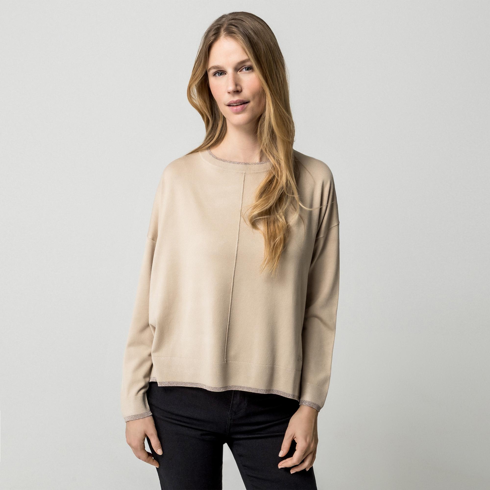 Dieser Pullover verfügt über einen klassischen Rundhalsausschnitt und lange Ärmel, was ihn zu einer vielseitigen Ergänzung für jede Garderobe macht. Das Design umfasst subtile Details am Ausschnitt, an den Ärmelbündchen und am Saum, die dem Kleidungsstück einen Hauch von Glanz verleihen.