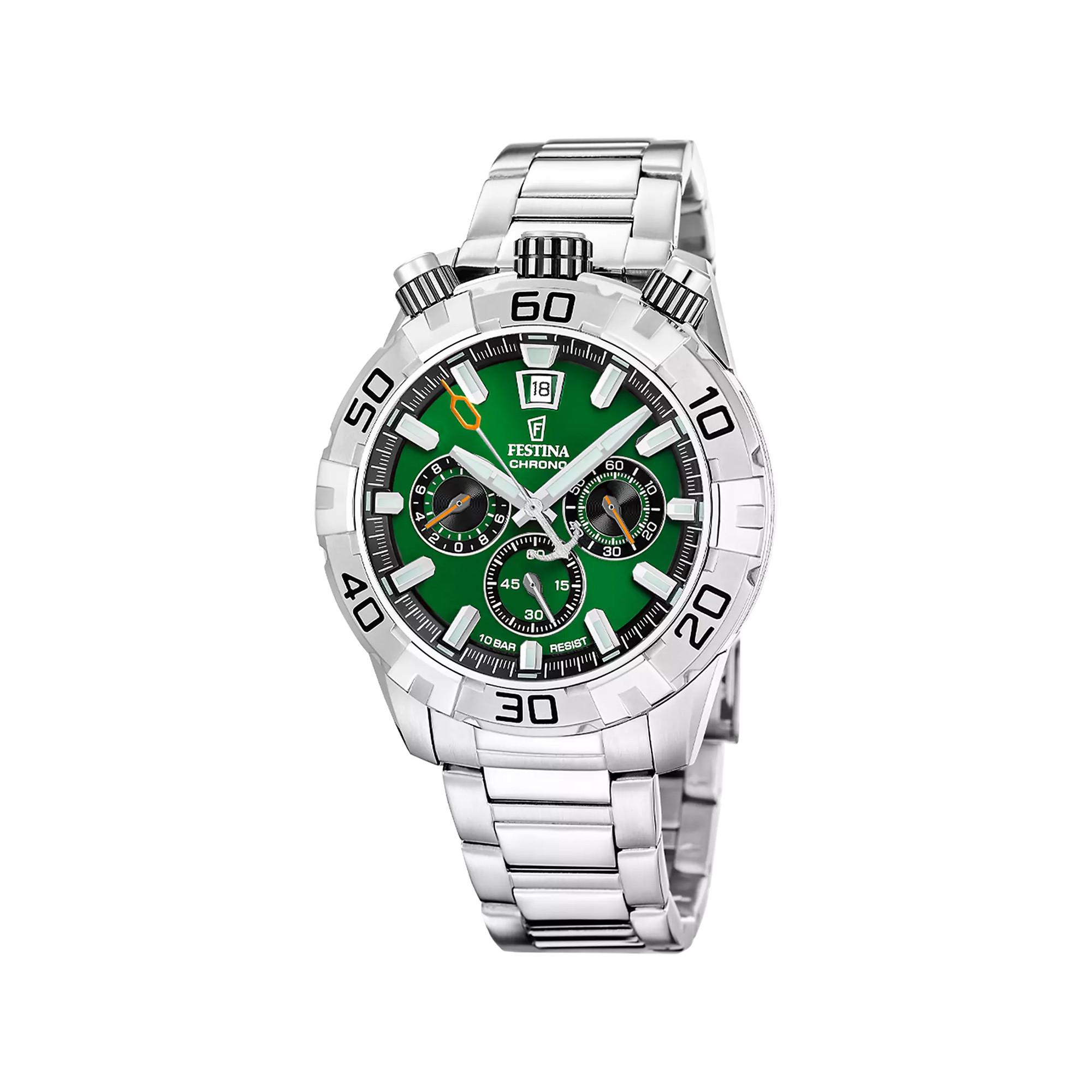 Die Festina Bullhead F20743/2 beeindruckt mit einem lebendigen grünen Zifferblatt und einem robusten 45-mm-Edelstahlgehäuse. Das Edelstahlarmband unterstreicht die Widerstandsfähigkeit und den sportlichen Charakter, während das markante Bullhead-Design mit Drückern an der Oberseite diese Uhr zu einem aussergewöhnlichen Zeitmesser macht.