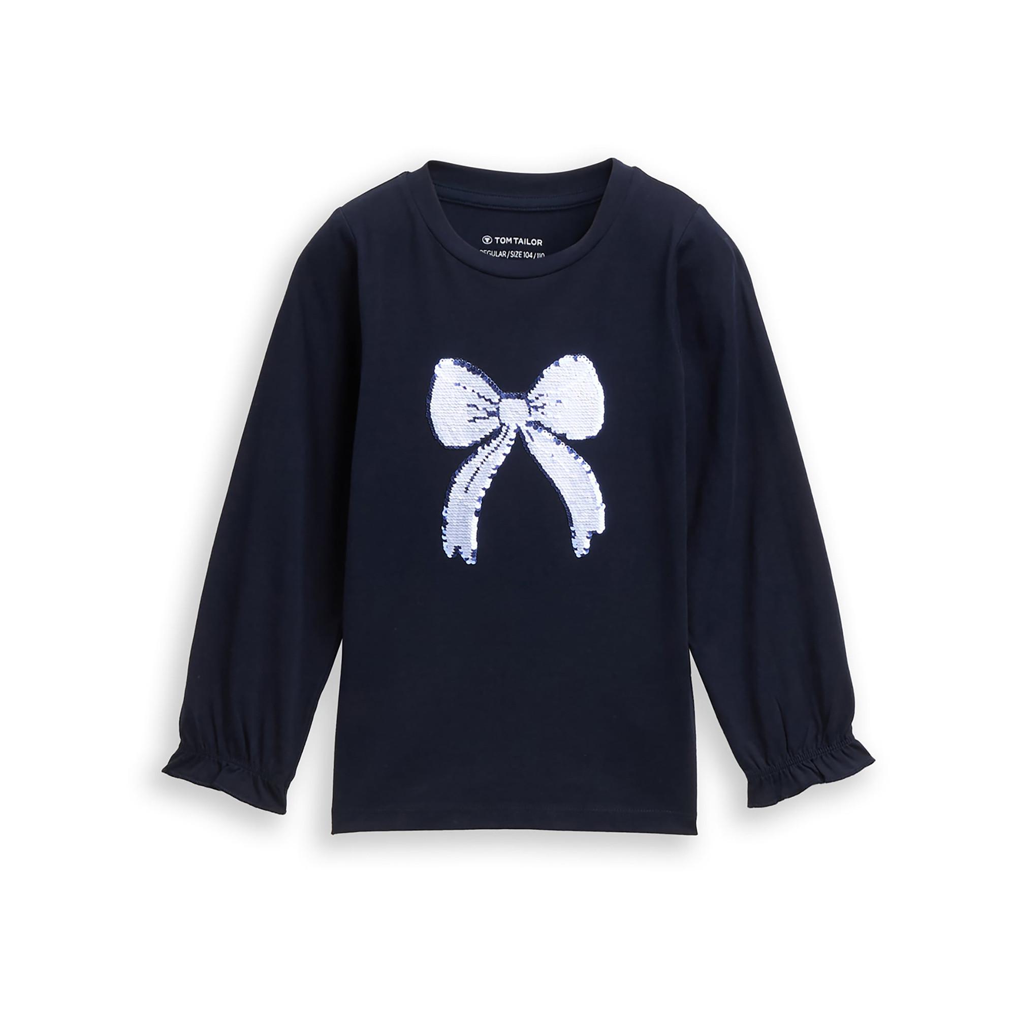 Das Tom Tailor Langarmshirt für Kinder begeistert mit einem verspielten Motiv und Wendepailletten auf der Vorderseite. Aus weichem Single-Jersey gefertigt, bietet es hohen Tragekomfort und eine nachhaltige Materialkombination. Mit Volant-Details und elastischem Ärmelabschluss ist es ideal für den Alltag.