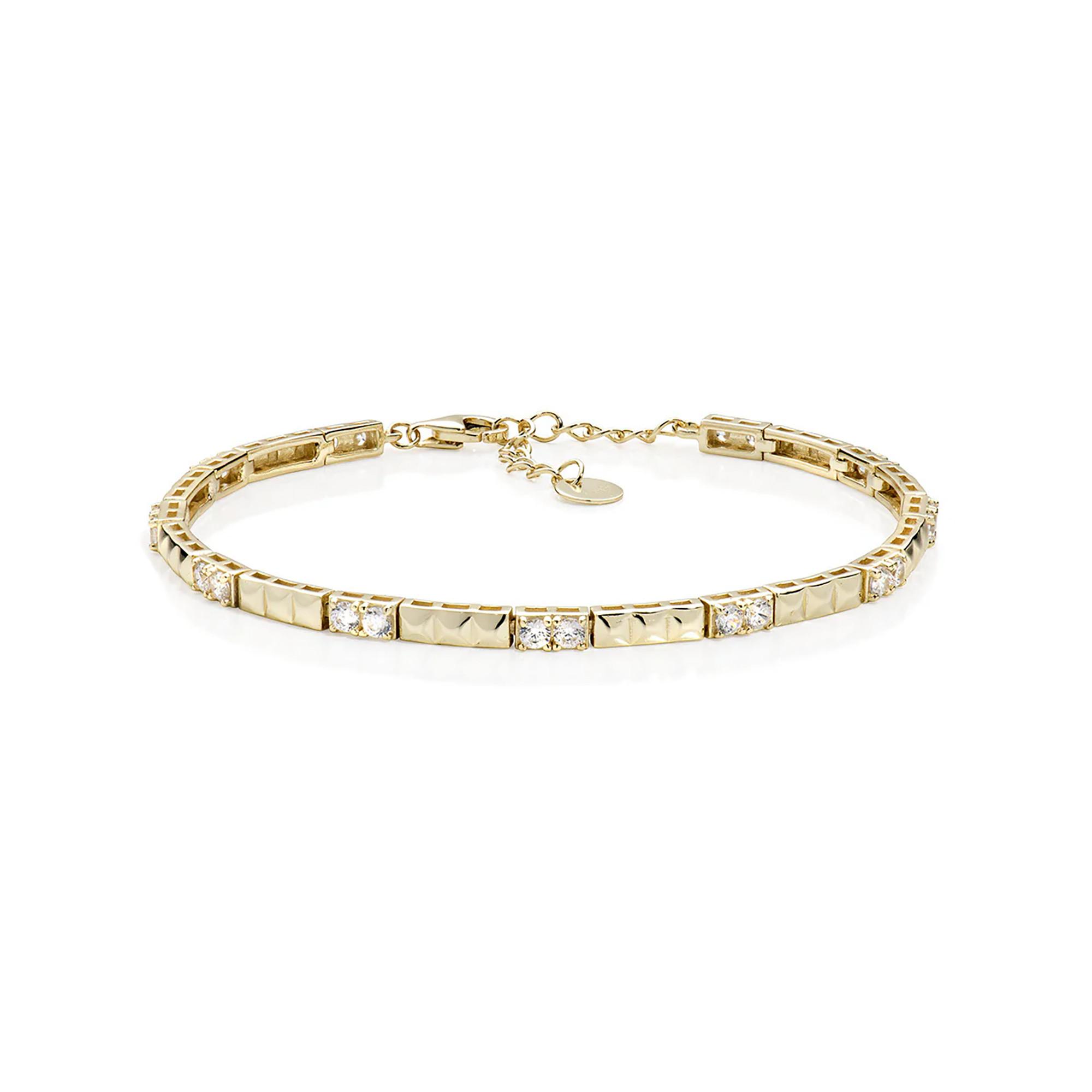 Dieses Damen-Armband aus Silber besticht durch sein elegantes Gold-Finish und funkelnde weisse Zirkonia. Mit einer verstellbaren Länge von 16 bis 19 cm und einem Gewicht von 7,8 g ist es ein stilvolles und auffälliges Accessoire für jeden Anlass.