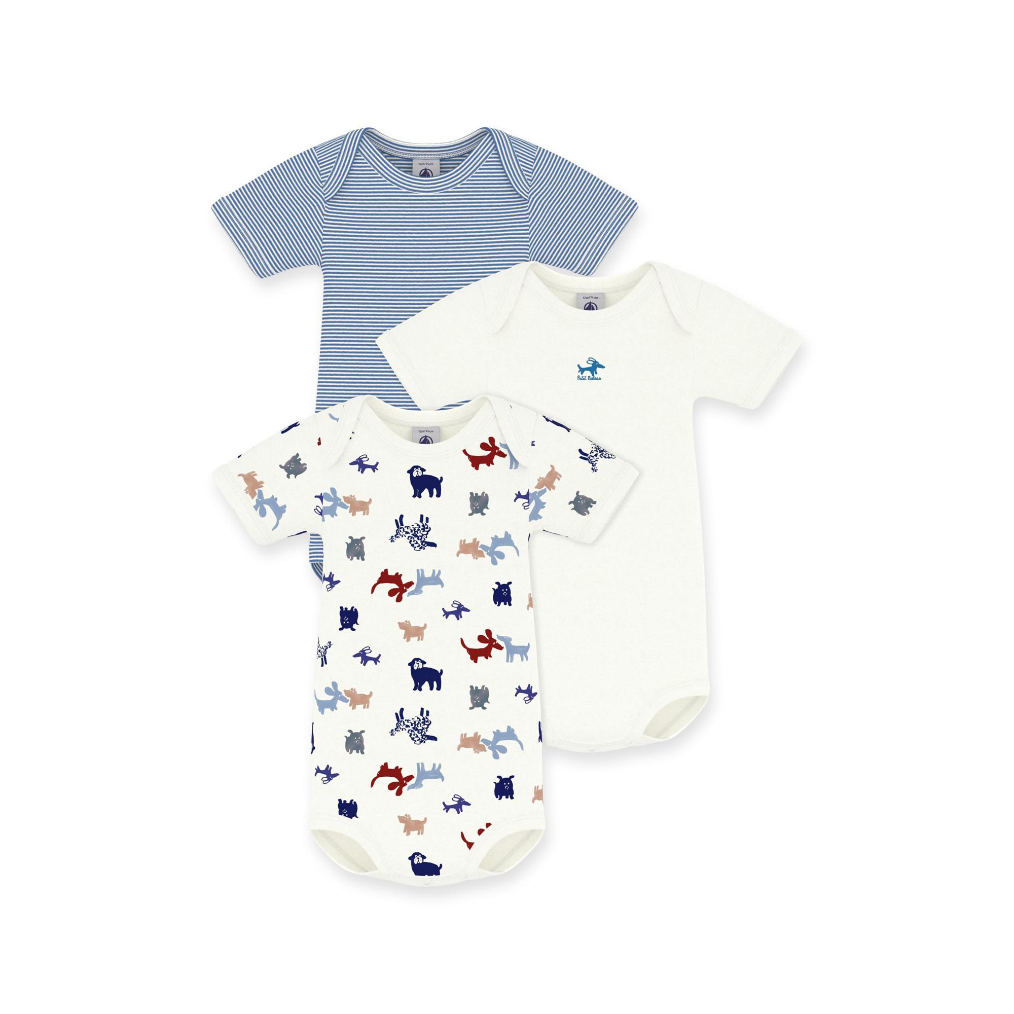 3er-Pack Unisex-Bodys mit kurzen Ärmeln aus 1X1-Rippstrick, einem dehnbaren und bequemen Material. Wenn das Baby wächst, ersetzt der Body mit amerikanischem Ausschnitt den Wickelbody. Dank seiner weiten Öffnung lässt sich das Baby leicht über den Kopf anziehen, ohne dass es eingeengt wird! Druckknopföffnung im Schritt. Dieses 3er-Pack enthält einen einfarbigen Body mit Siebdruck, einen Body mit Milleraie-Streifen und einen Body mit Hundemotiv. Ein lustiges und verspieltes Tiermotiv, das für einen Hauch von Fantasie und Fröhlichkeit sorgt.