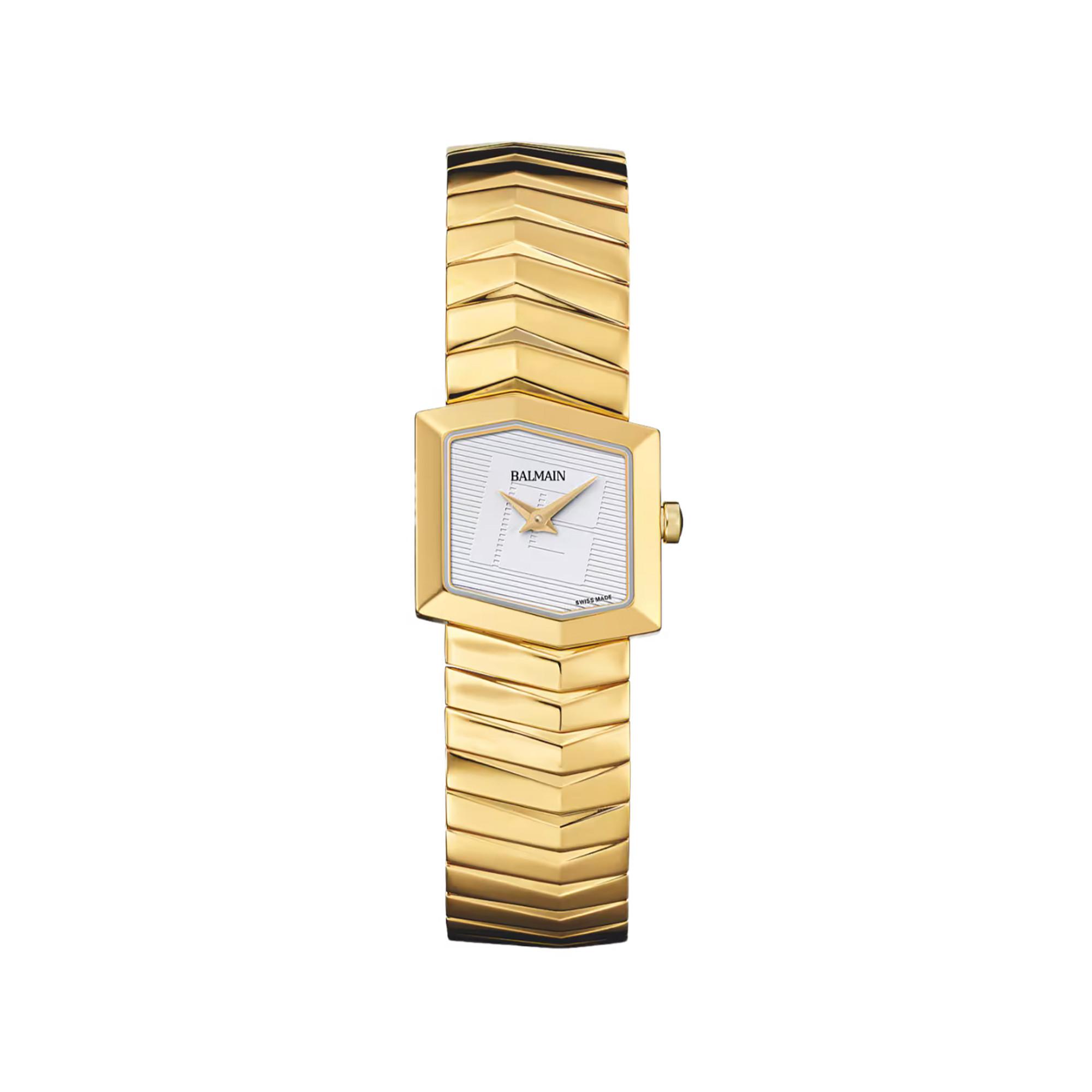Die Balmain Taffetas Damenuhr vereint asymmetrische Eleganz mit modernem Charme und besticht durch ihr vollständig gelbgoldenes PVD-Sechskantgehäuse. Das weisse Zifferblatt mit feinem Balmain-Logo, Saphirglas und Swiss-Made Präzision machen diese Uhr zu einem zeitlosen und stilvollen Accessoire.