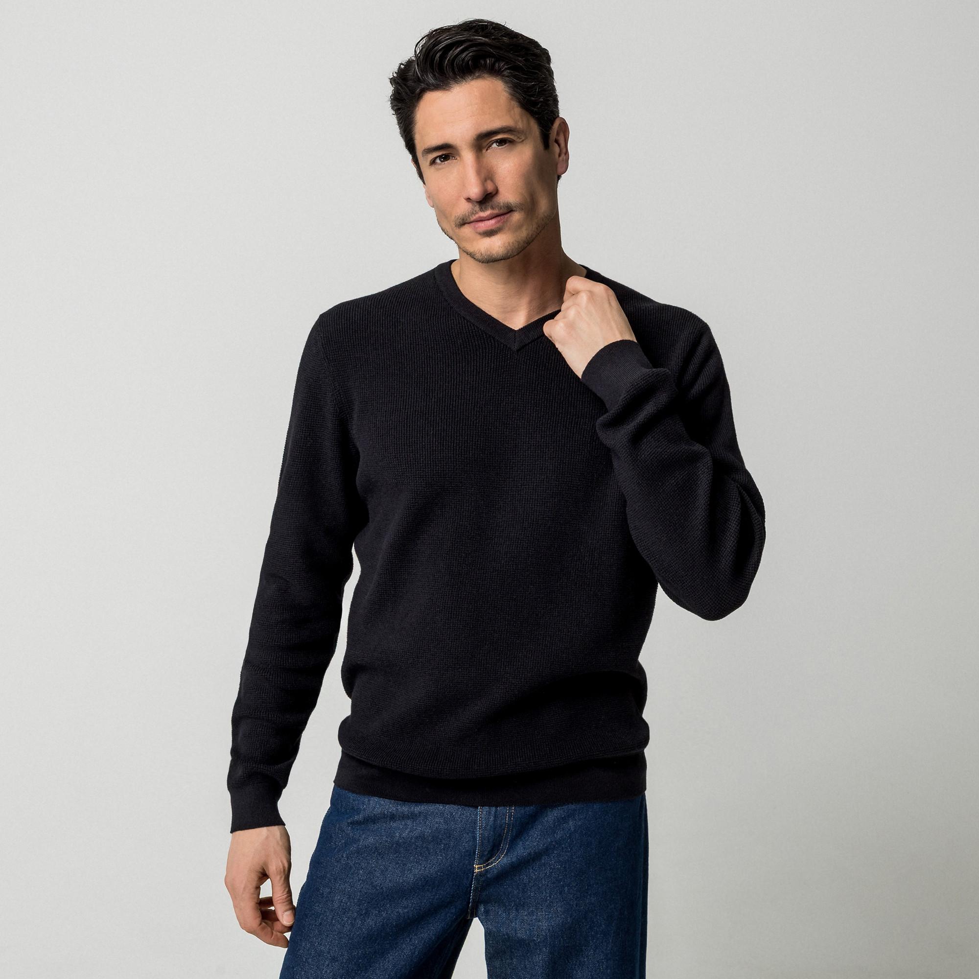 Dieser Pullover mit V-Ausschnitt ist eine vielseitige Ergänzung für jede Garderobe und bietet sowohl Komfort als auch Stil. Sein klassisches Design macht ihn für verschiedene Anlässe geeignet, von Freizeitausflügen bis hin zu eleganteren Veranstaltungen.