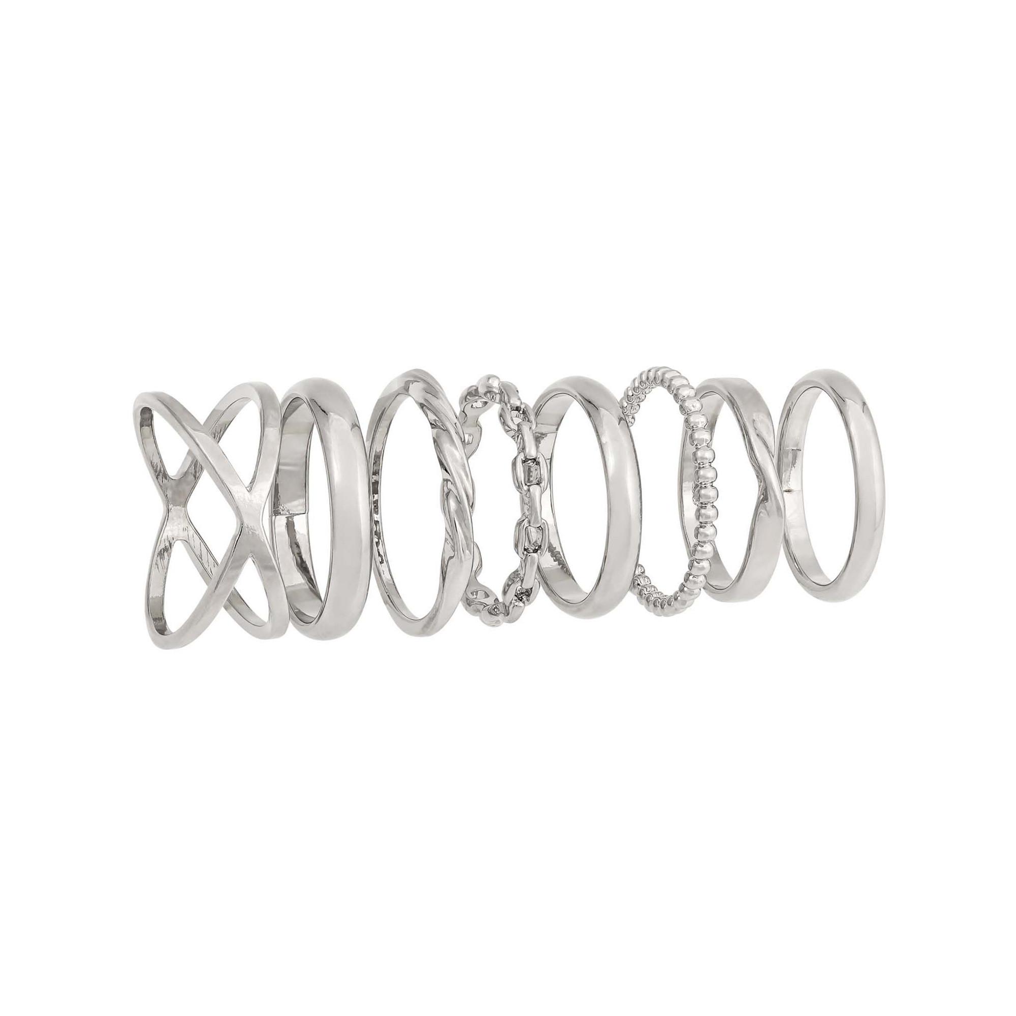 Das Ring-Set - Bright Day schimmert silberfarben und ist rhodiniert. Das Ring-Set besteht aus acht Ringen in unterschiedlichen Designs. Die Ringe haben verschiedene Formen und eine glänzende Oberfläche.