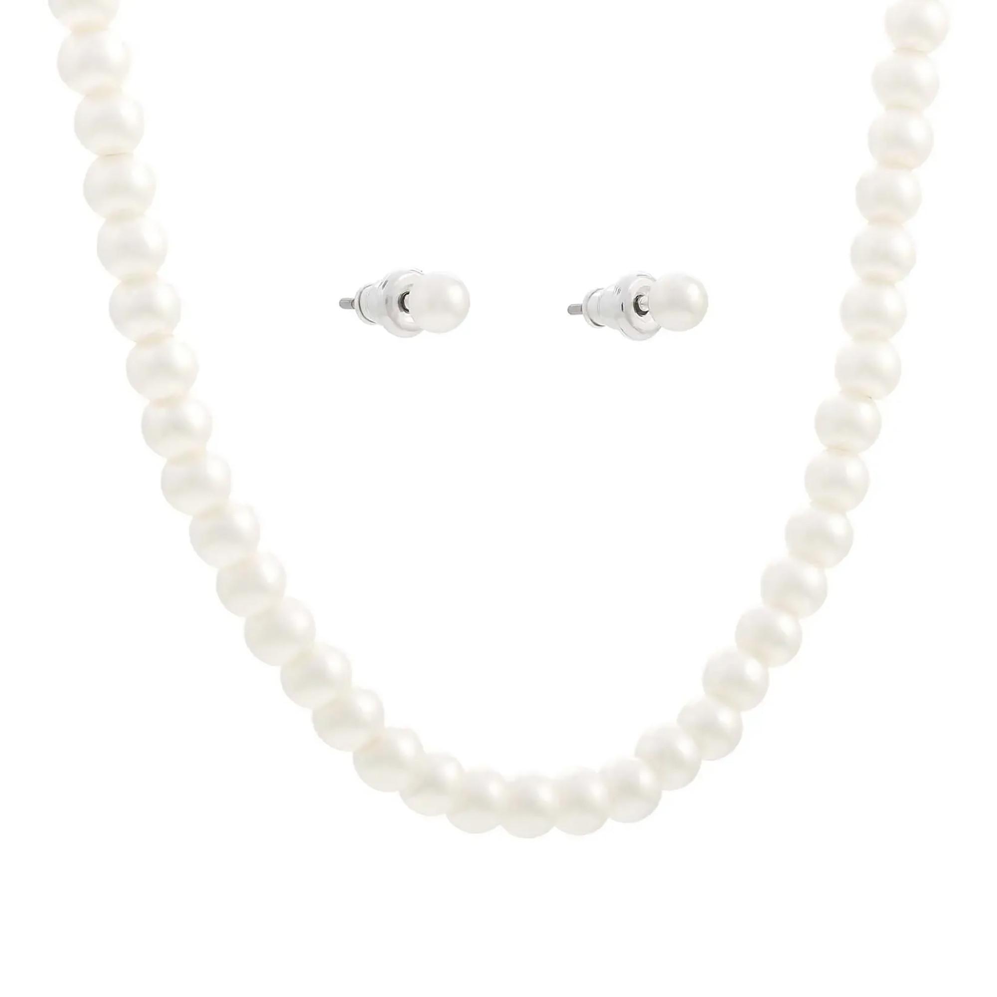 Das Schmuckset - Tiny Pearls schimmert silberfarben und ist rhodiniert. Das Schmuckset besteht aus einer Kette und einem Paar Ohrsteckern, welche mit vielen weissen Kunstperlen beschmückt sind. Die Kette besitzt eine Verlängerungskette und lässt sich perfekt kombinieren.