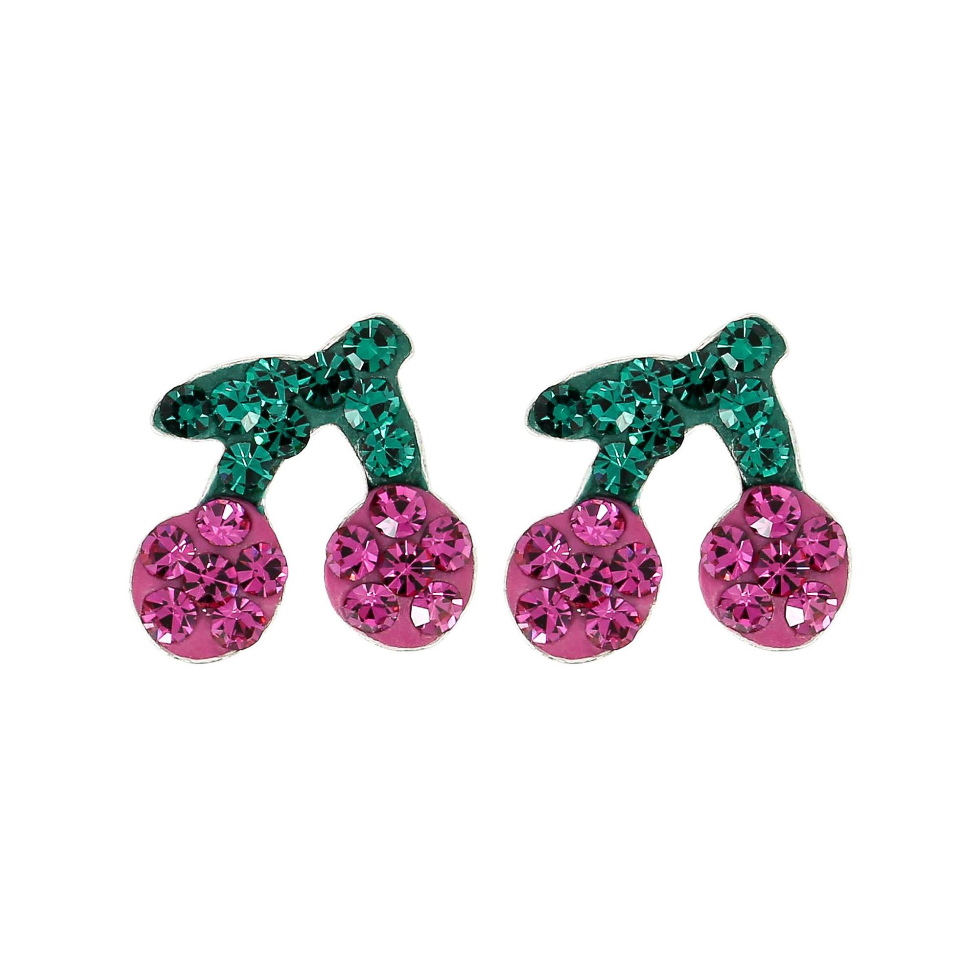 Diese verspielten Ohrstecker aus 925er Silber im Kirschen-Design sind mit pinken und grünen Strasssteinen verziert und bringen Farbe in jedes Outfit. Mit einer Länge von 1 cm und einer Breite von 0,9 cm sind sie klein, aber auffällig.