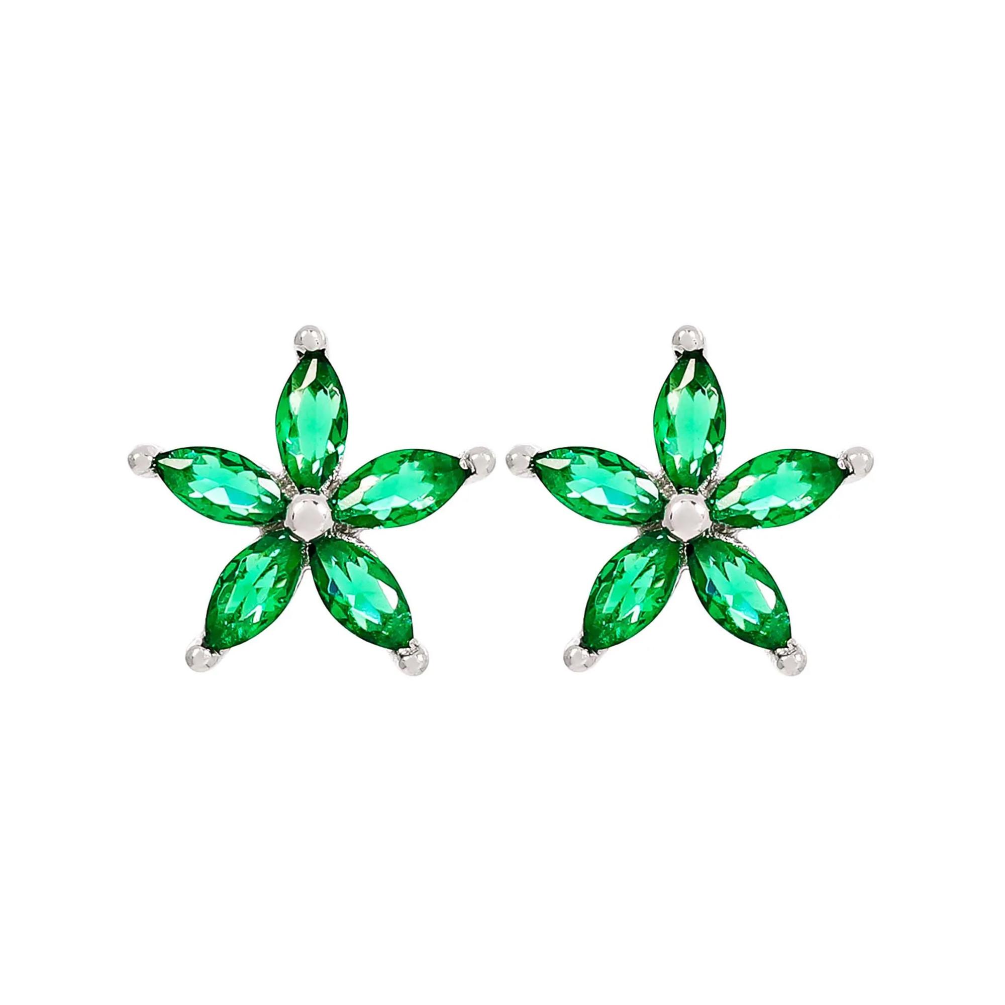 Die Ohrstecker - Floral Emerald schimmern silberfarben und bestehen aus 925er Echtsilber. Die Oberfläche ist rhodiniert. Sie sind in Form von Blumen designt und mit Cubic Zirkonia Steinen beschmückt, welche in einem wunderschönen grün funkeln.
