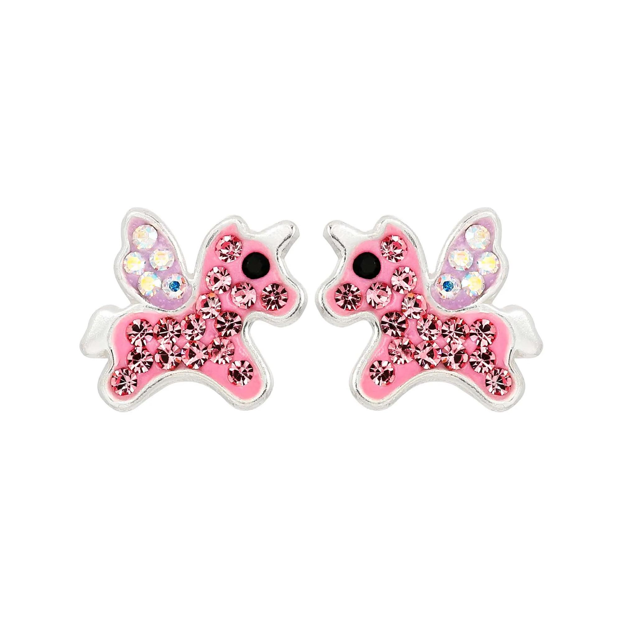 Die Ohrstecker - Magical Fantasy schimmern silber-, sowie rosafarben und bestehen aus 925er Echtsilber. Sie sind in der Form eines Einhornes designt, welches zusätzlich mit rosafarbenen Strasssteinen beschmückt ist. Die Flügel sind mit Strasssteinen beschmückt, welche in Regenbogenfarben schimmern.