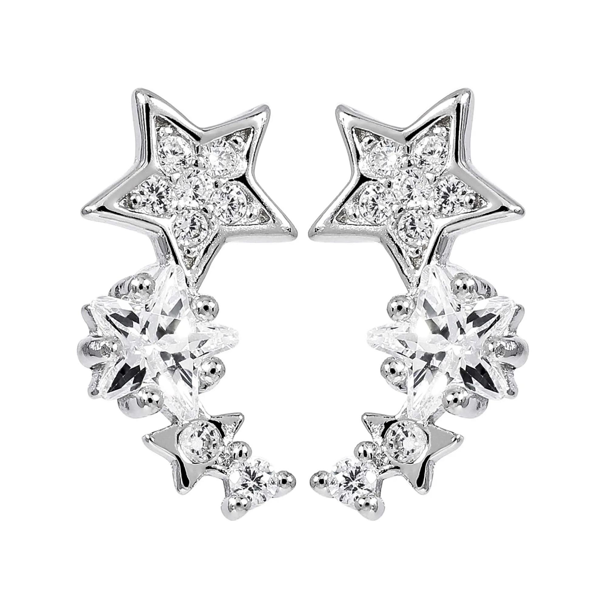 Die Ohrstecker - Night Stars schimmern silberfarben und bestehen aus 925er Echtsilber. Die Oberfläche ist rhodiniert. Die kleinen Sterne sind mit funkelnden Cubic Zirkonia Steinen in verschiedenen Grödden und Formen verziert.