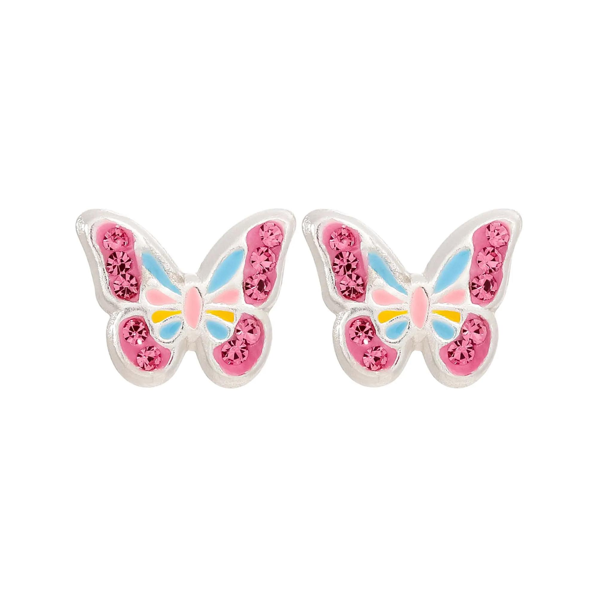 Die Ohrstecker - Pink Wings schimmern silberfarben und bestehen aus 925er Echtsilber. Die Ohrringe haben die Form von Schmetterlingen und sind mit funkelnden, rosafarbenen Strasssteinen verziert.