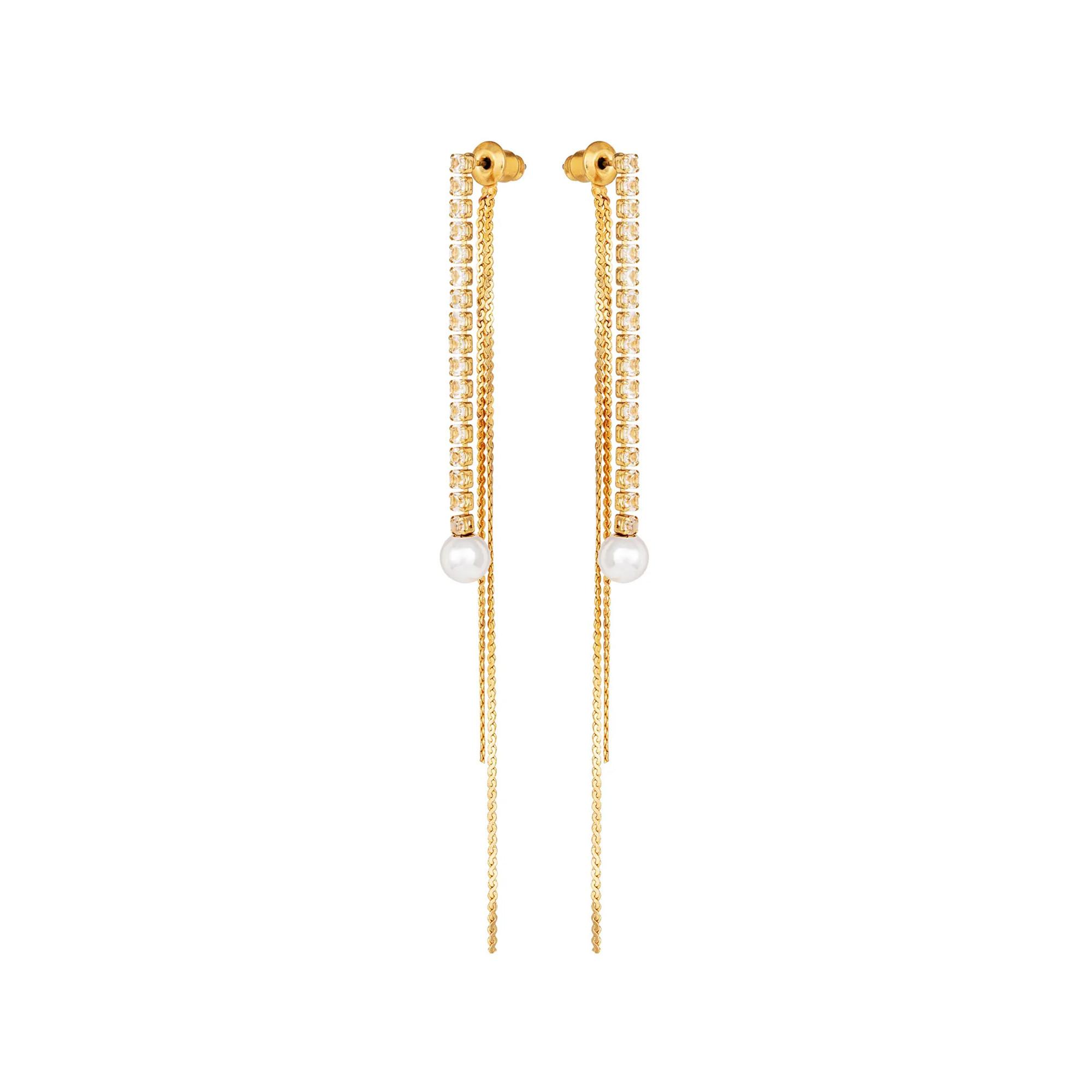 Die Ohrstecker Tassel Dream glänzen in edlem Gold und bestechen durch ihr auffälliges Front-Back-Design. Verziert mit funkelnden Strasssteinen und einer weissen Kunstperle, sind sie ein verspielter und eleganter Blickfang.