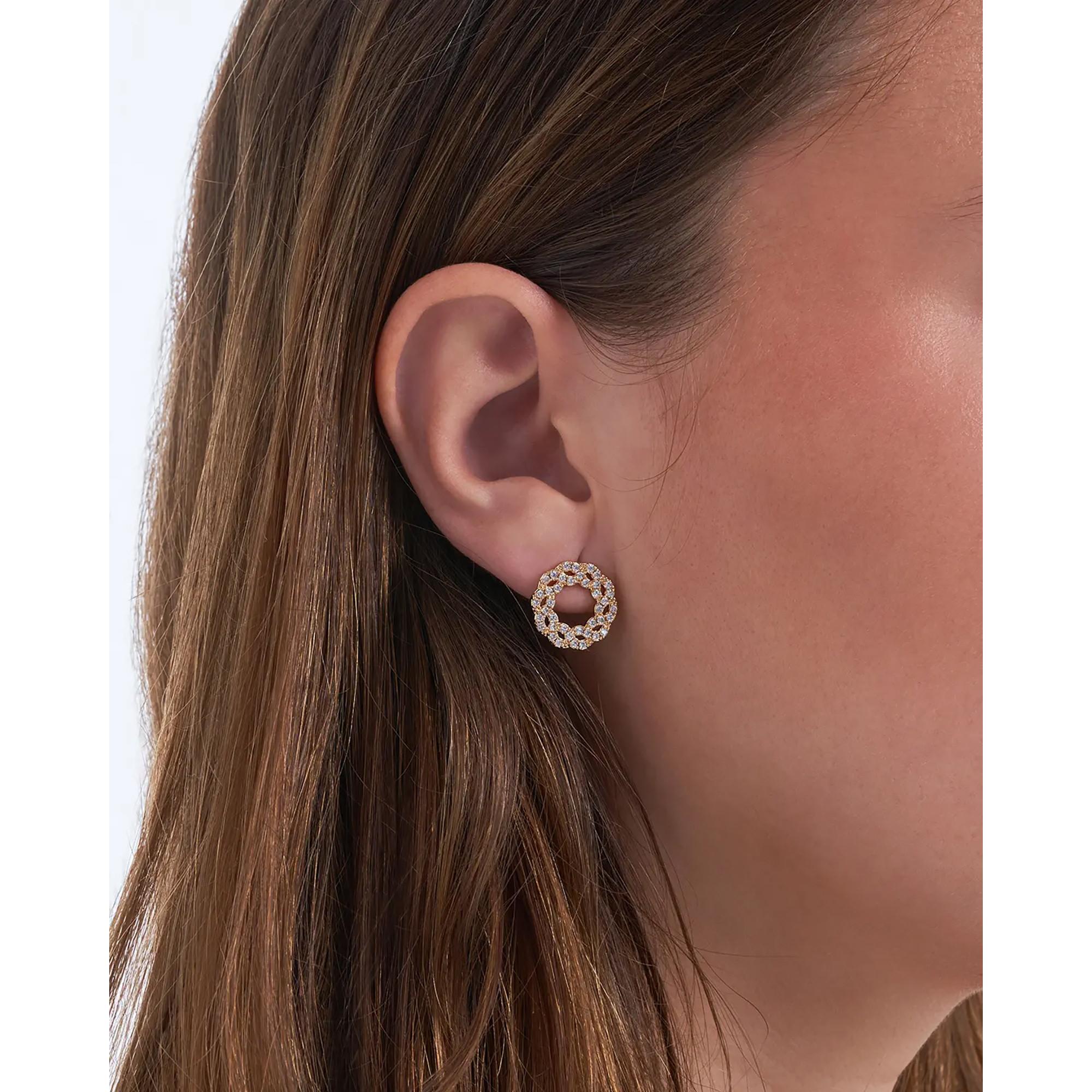 Die Ohrstecker – Luminous Circles sind goldplattiert und überzeugen mit einem runden, geflochtenen Design, das mit funkelnden Zirkonia-Steinen verziert ist. Der Titan-Stecker sorgt für angenehmen Tragekomfort und hohe Hautverträglichkeit. Ein zeitlos eleganter Ohrschmuck, der jeden Look veredelt.