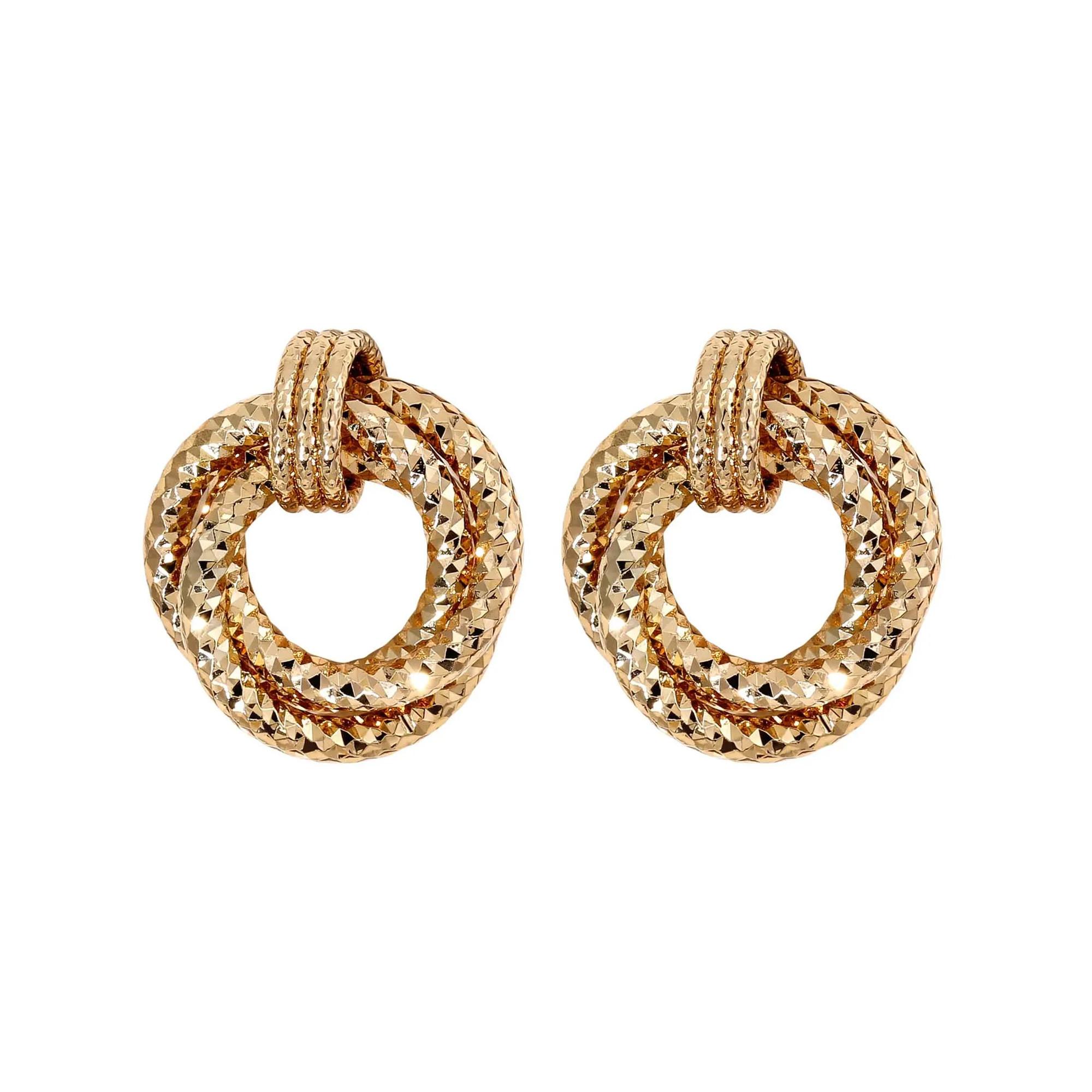 Die Ohrstecker Textured Glam glänzen in elegantem Gold und bestechen durch ihre strukturierte Metalloberfläche. Drei bewegliche Ringe in einer oberen Fassung verleihen den Ohrringen dynamischen Schwung und ein modernes Design.