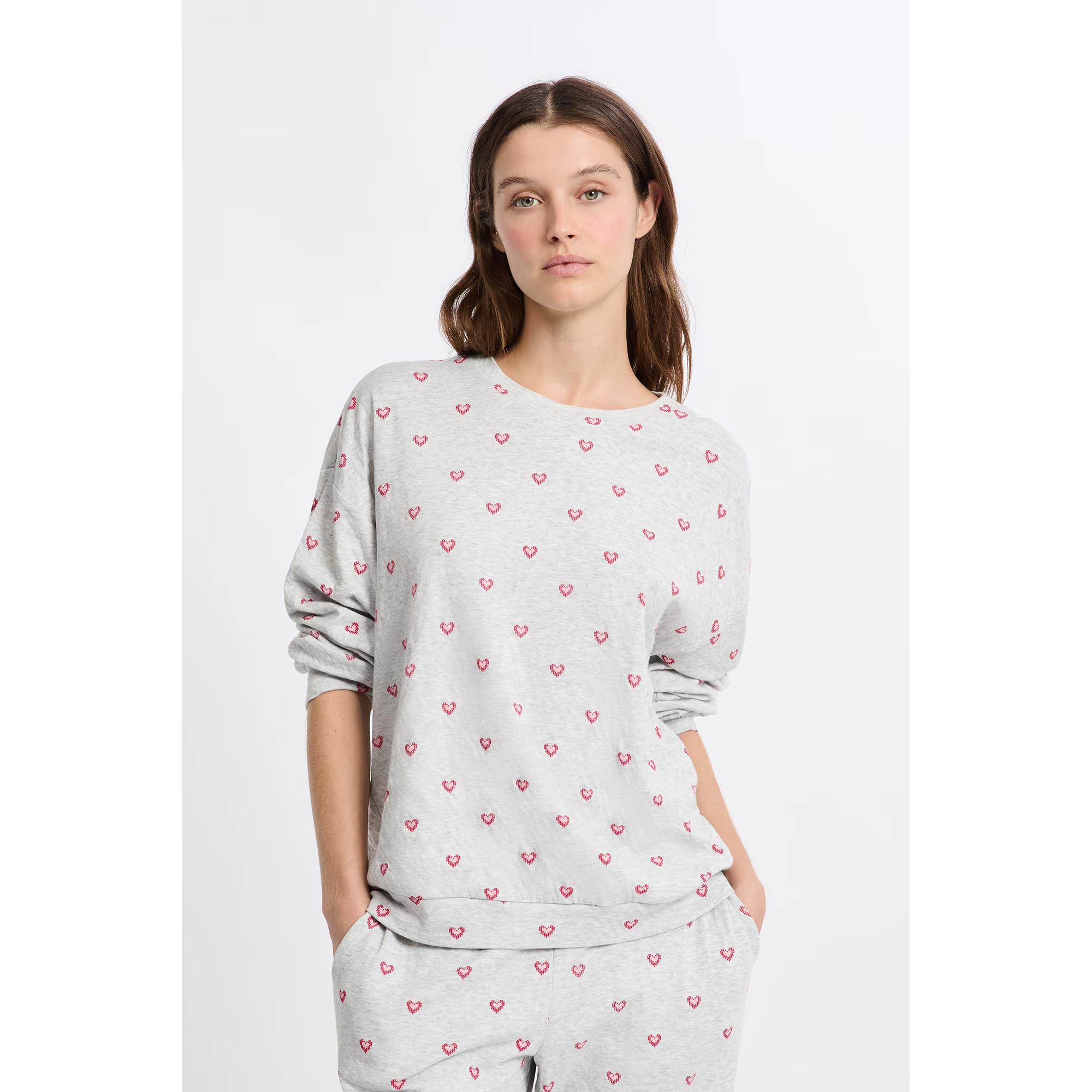 Dieses Langarm-T-Shirt präsentiert sich mit einem charmanten Herz-Print, der eine verspielte und dennoch bequeme Ergänzung für jede Garderobe darstellt. Das Design umfasst einen klassischen Rundhalsausschnitt und eine entspannte Passform, wodurch es sich für verschiedene legere Anlässe eignet.