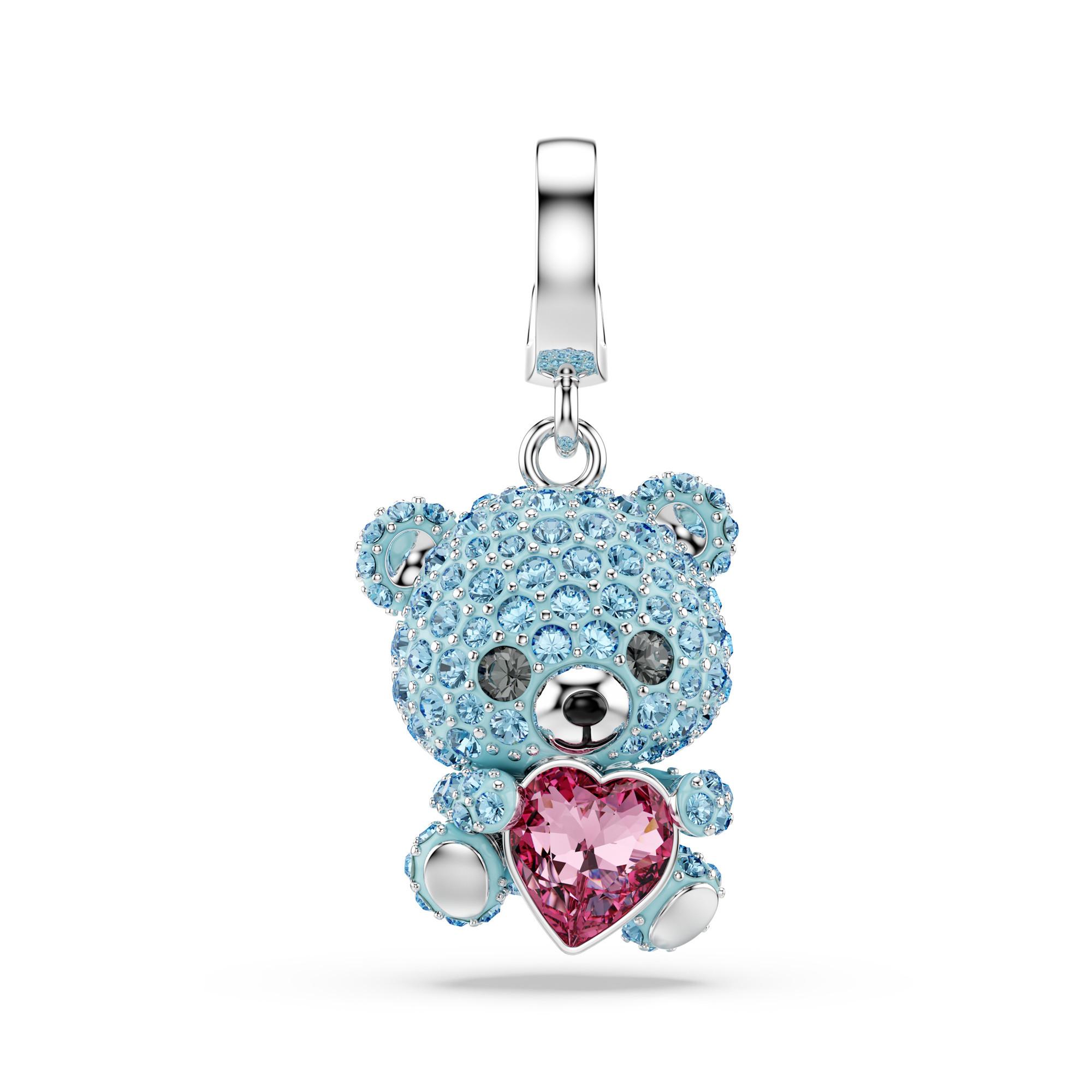 Verleihen Sie Ihrem Schmuck eine freudige Note mit diesem Teddybär-Charm. Der rhodinierte Teddy ist mit blauem Kristallpavé verziert und hält ein pinkfarbenes Kristallelement in Herzform als romantische Geste. Befestigen Sie den Teddy an Ihren Swarovski Armbändern oder Halsketten, um Ihren Look individuell zu gestalten.