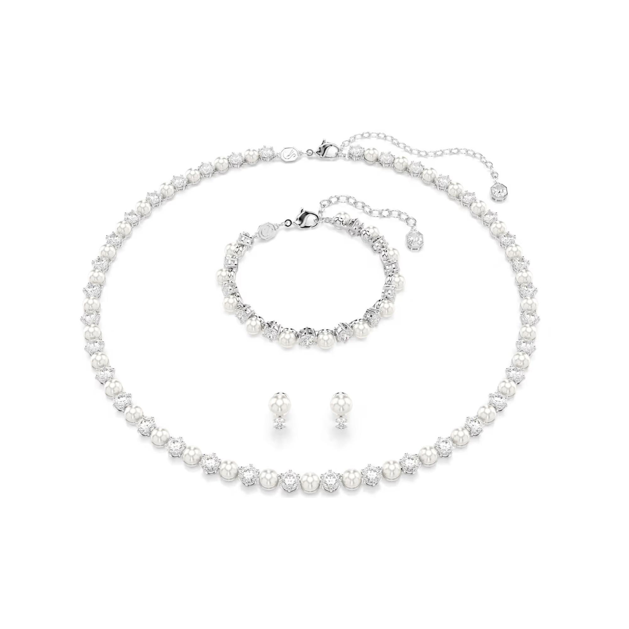 Dieses Matrix Schmuck-Set, bestehend aus einer Halskette, einem Armband und einem zarten Paar Ohrstecker, verleiht Ihrem Stil eine besonders elegante Note. Jedes rhodinierte Stück bietet eine luxuriöse Balance aus klaren Swarovski Zirconia und weissen Swarovski Crystal Pearls und setzt dem klassischen Tennis-Design eine moderne Note auf. Tragen Sie dieses Set selbst oder schenken Sie es jemand Besonderem als strahlendes Geschenk.