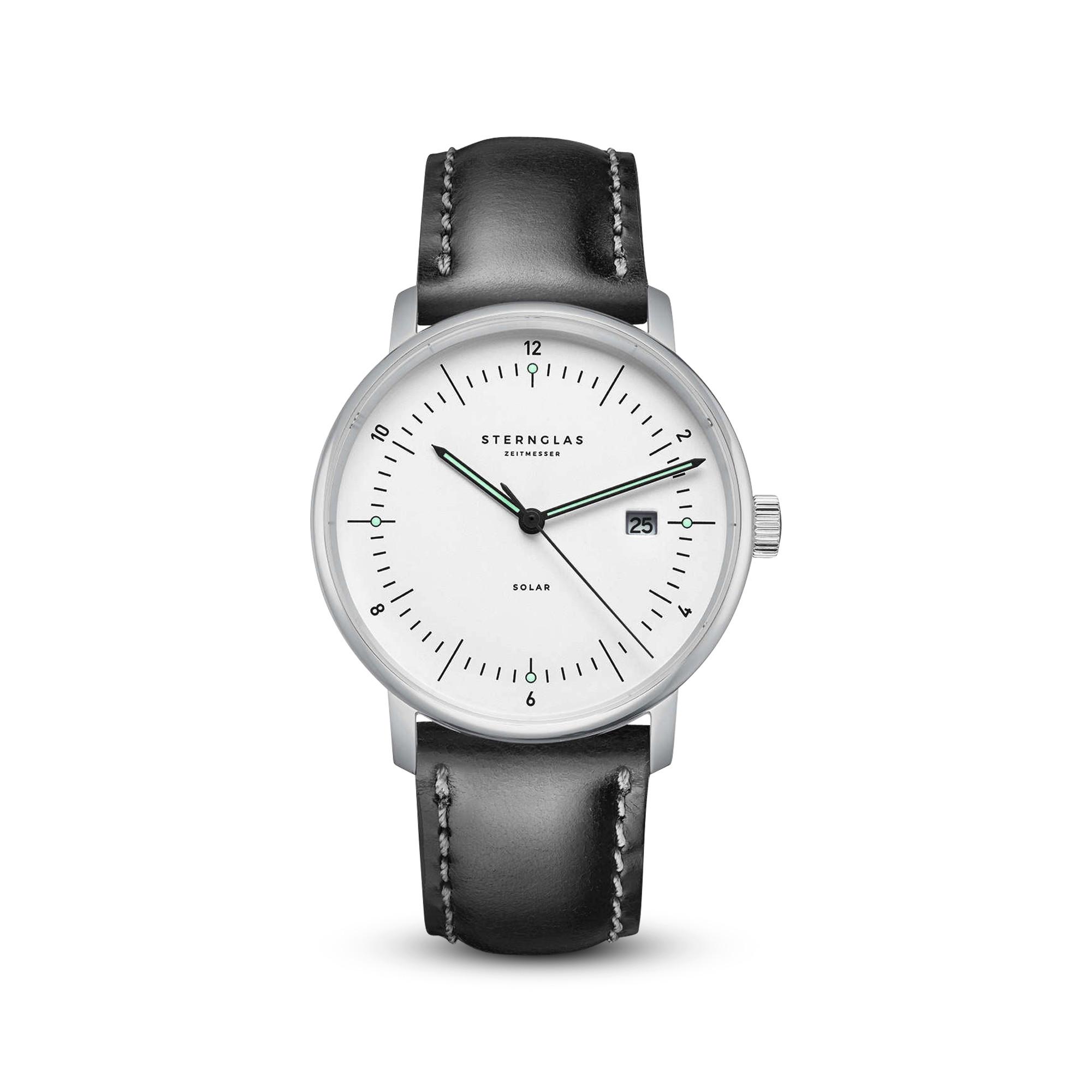 Die Naos Solar ist die erste Sternglas Uhr, die ihre Energie direkt aus Licht gewinnt und dank integriertem Solarpanel bis zu vier Monate Laufzeit auch ohne Tageslicht erreicht. Erhältlich in Weiss mit schwarzen Zeigern und türkisen Luminova-Akzenten oder in Dunkelgrün mit edler PVD-Gold-Beschichtung, verbindet sie nachhaltige Technologie mit moderner Schlichtheit.