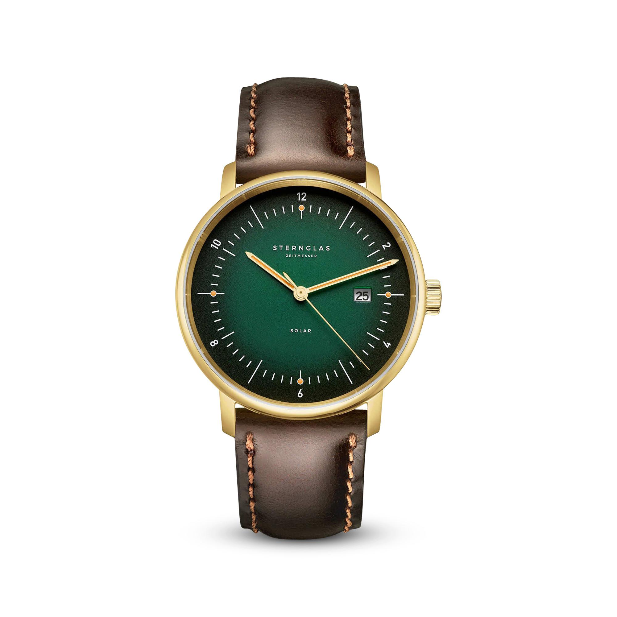 Die Naos Solar ist die erste Sternglas Uhr, die ihre Energie direkt aus Licht gewinnt und dank integriertem Solarpanel bis zu vier Monate Laufzeit auch ohne Tageslicht erreicht. Erhältlich in Weiss mit schwarzen Zeigern und türkisen Luminova-Akzenten oder in Dunkelgrün mit edler PVD-Gold-Beschichtung, verbindet sie nachhaltige Technologie mit moderner Schlichtheit.