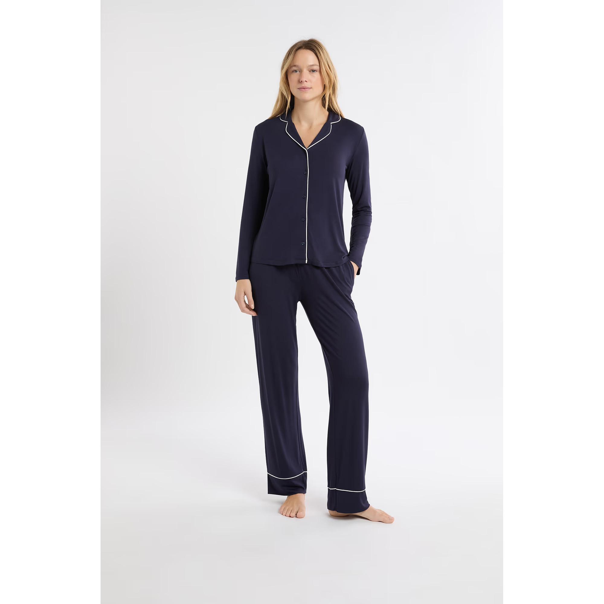 Dieses Pyjama-Set bietet Komfort und Stil für erholsame Nächte. Das langärmelige Oberteil verfügt über eine klassische Knopfleiste und einen Umlegekragen, ergänzt durch kontrastierende Paspeln, die eine raffinierte Note verleihen. Die passenden langen Hosen sind mit einem elastischen Bund für eine bequeme, lockere Passform ausgestattet und weisen ebenfalls das gleiche elegante Paspeldetail am Saum auf.