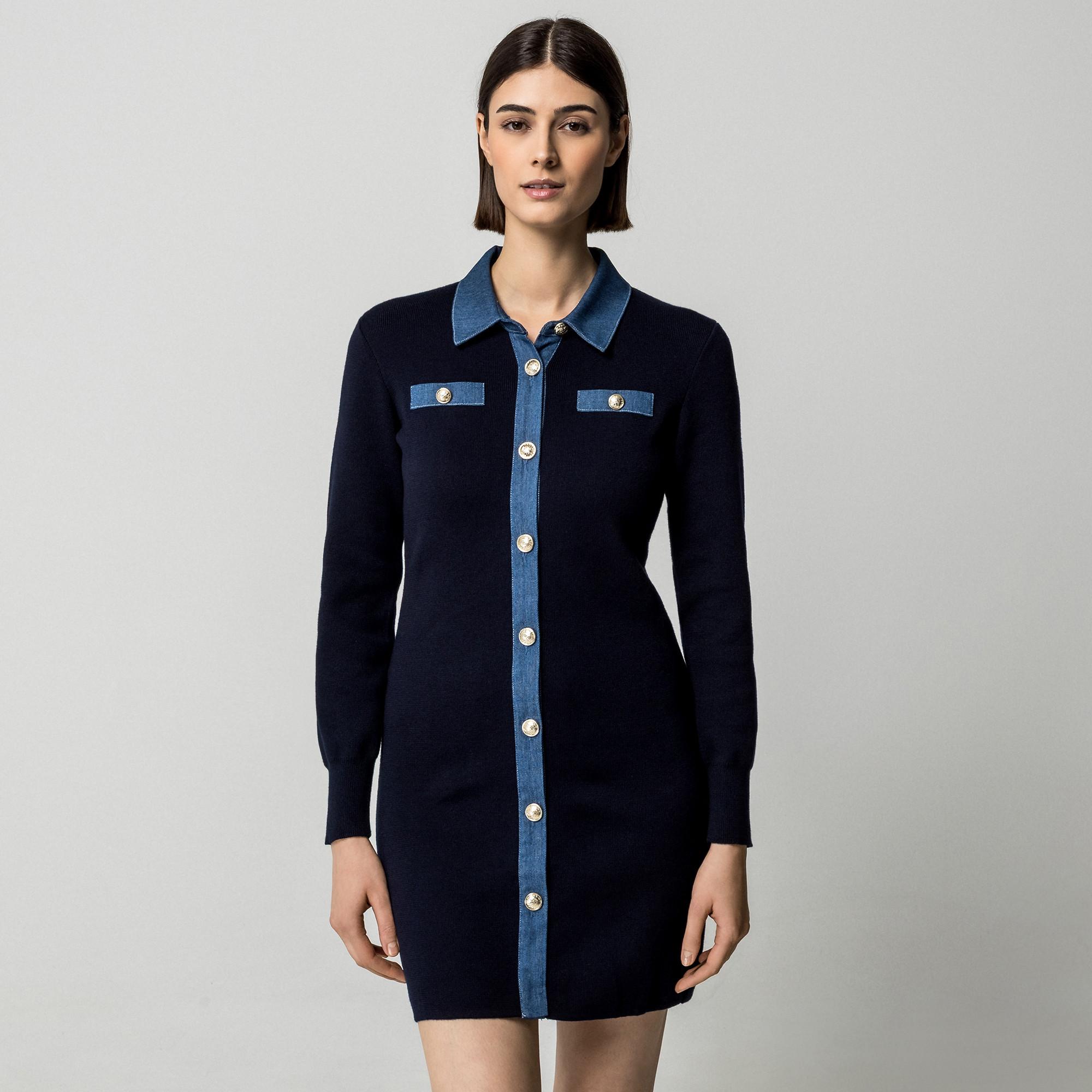Dieses langärmelige Mini-Hemdkleid besticht durch ein raffiniertes Design mit Denim-Akzenten. Das Kleid zeichnet sich durch seinen Kentkragen und eine durchgehende Knopfleiste aus, die durch dekorative goldfarbene Knöpfe hervorgehoben wird. Zwei Brusttaschen mit Denim-Klappen verleihen der Vorderseite eine stilvolle Note.