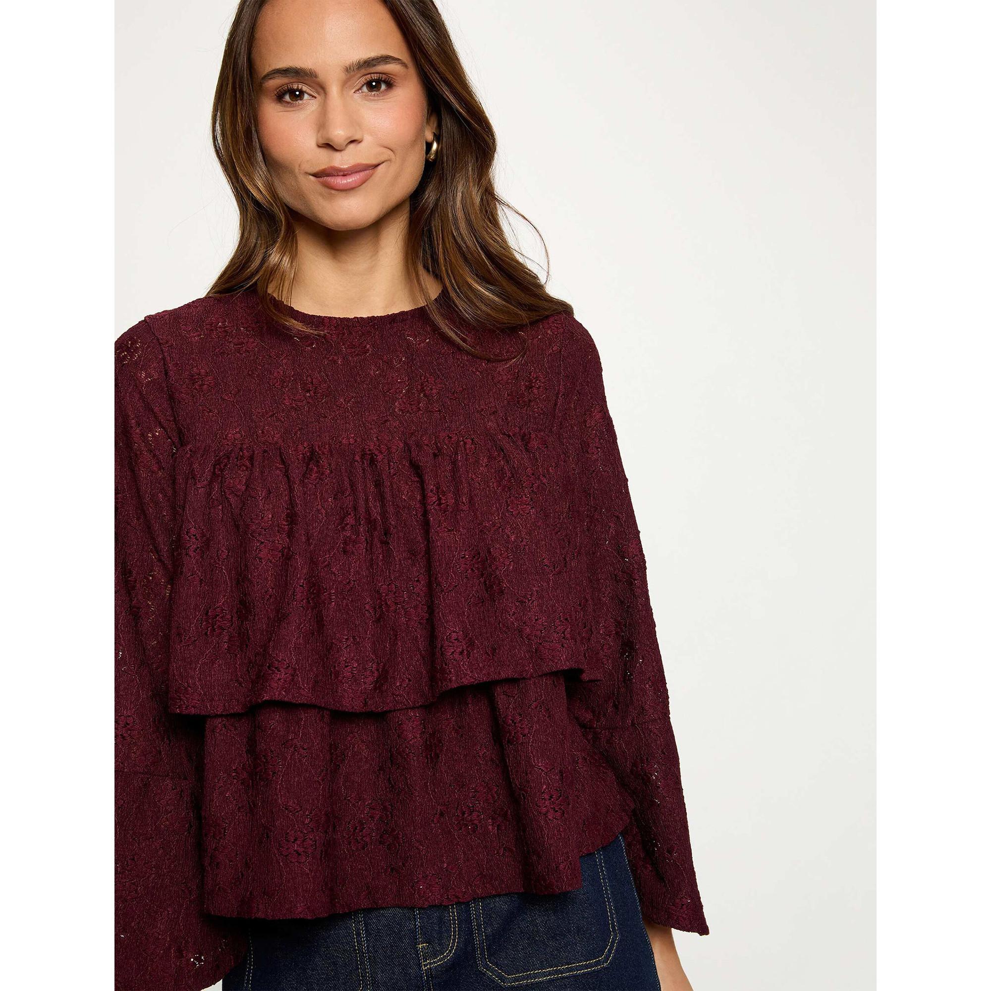 Dieses elegante Langarm-T-Shirt besticht durch ein zartes Spitzendesign mit einem charmanten Rüschendetail über der Brust. Der Rundhalsausschnitt und die Schlüssellochöffnung am Rücken verleihen einen Hauch von Raffinesse und machen es zu einem vielseitigen Kleidungsstück für verschiedene Anlässe.