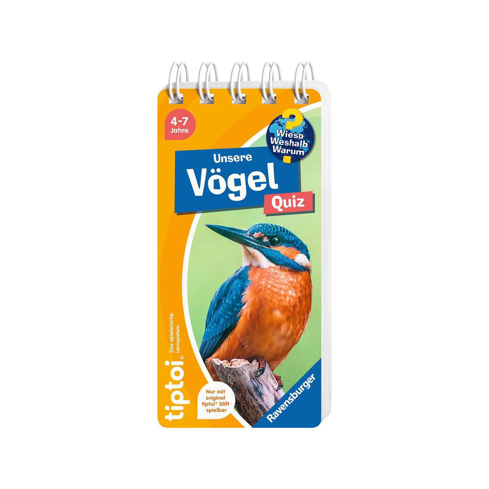 Singt die Nachtigall in der Nacht?Amsel, Singdrossel, Buchfink und Star: Mit diesem tiptoi Quiz entdecken Kinder ab 4 Jahren die heimische Vogelwelt. Sie lernen spannendes Sachwissen über die unterschiedlichen Lebensweisen und erfahren, warum das Rotkehlchen streitlustig ist, der Höckerschwan seine Küken auf dem Rücken trägt oder der Grünspecht eine lange Zunge hat. Über 200 Quizfragen, tolle Fotos und Original-Vogelstimmen motivieren zum selbstständigen Entdecken und garantieren ein abwechslungsreiches Spiel.Kinder ab 4 Jahren entdecken mit der Reihe „tiptoi® Wieso? Weshalb? Warum? Quiz“ spannendes Sachwissen zu ihren Lieblingsthemen. Durch das kompakte Format eignen sich die Quizblöcke besonders gut zum Mitnehmen und sorgen auch unterwegs für eine sinnvolle Beschäftigung, die Spass macht. Mit über 200 Quizfragen garantiert jedes Quiz ein abwechslungsreiches Spiel.tiptoi-Stift nicht enthalten. Muss separat erworben werden.