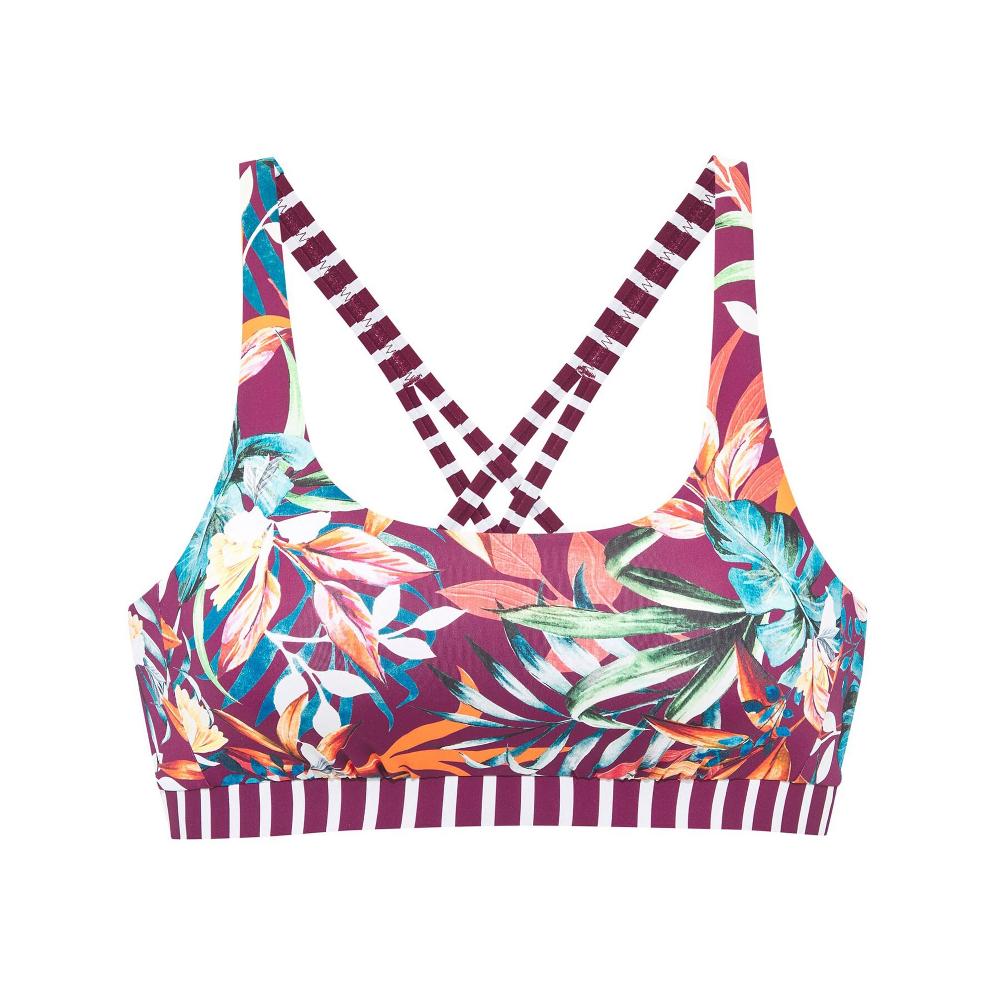 Dieses Bustier präsentiert sich mit einem lebhaften Blumenmuster und ist eine stilvolle Wahl für verschiedene Aktivitäten. Das Design umfasst eine bequeme Passform und ein einzigartiges Trägerdetail am Rücken.