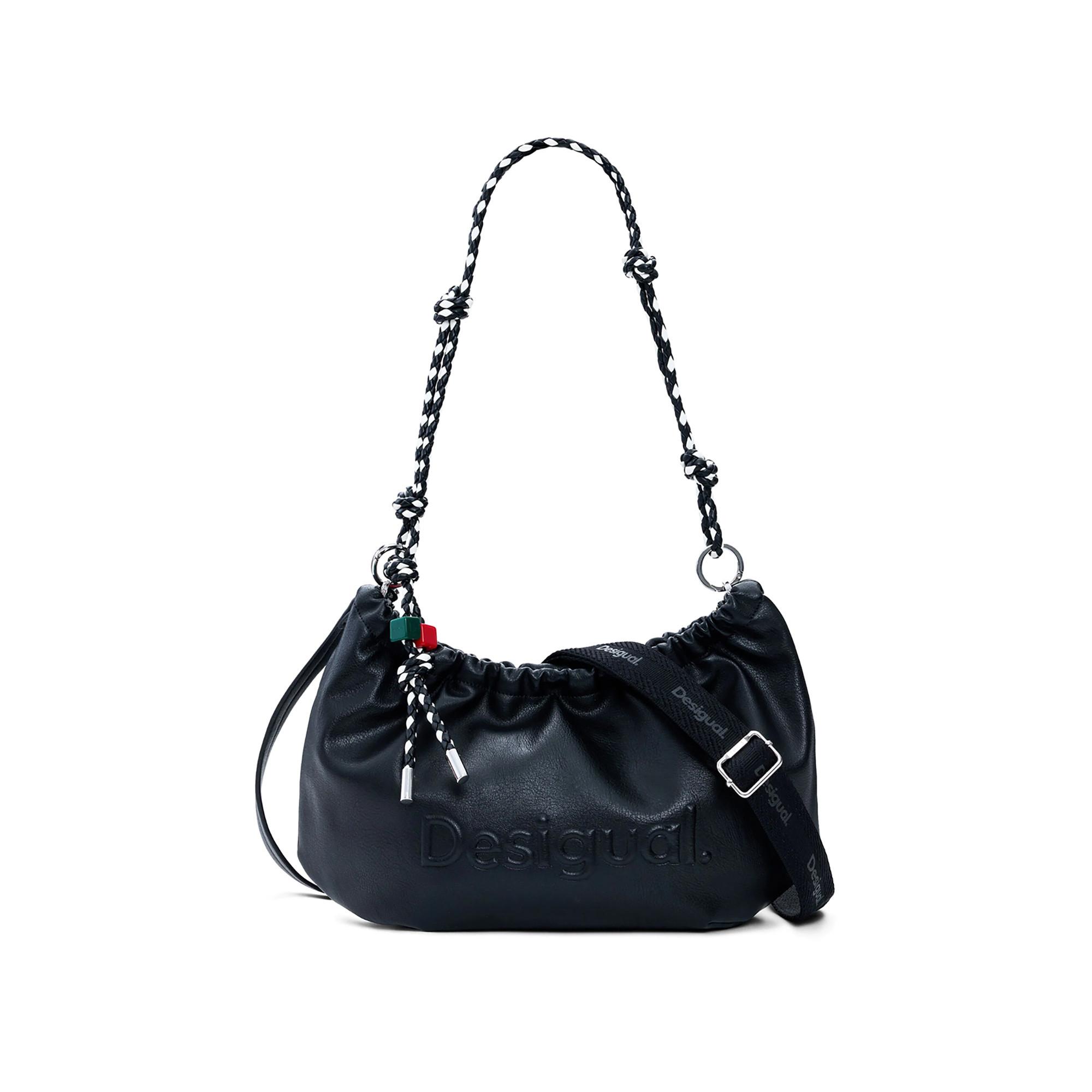 Diese Schultertasche präsentiert sich in einem weichen, gerafften Design mit einem geprägten Logo auf der Vorderseite. Sie verfügt über einen geflochtenen Griff mit dekorativen Elementen und einen abnehmbaren, verstellbaren Riemen für vielseitige Tragemöglichkeiten.