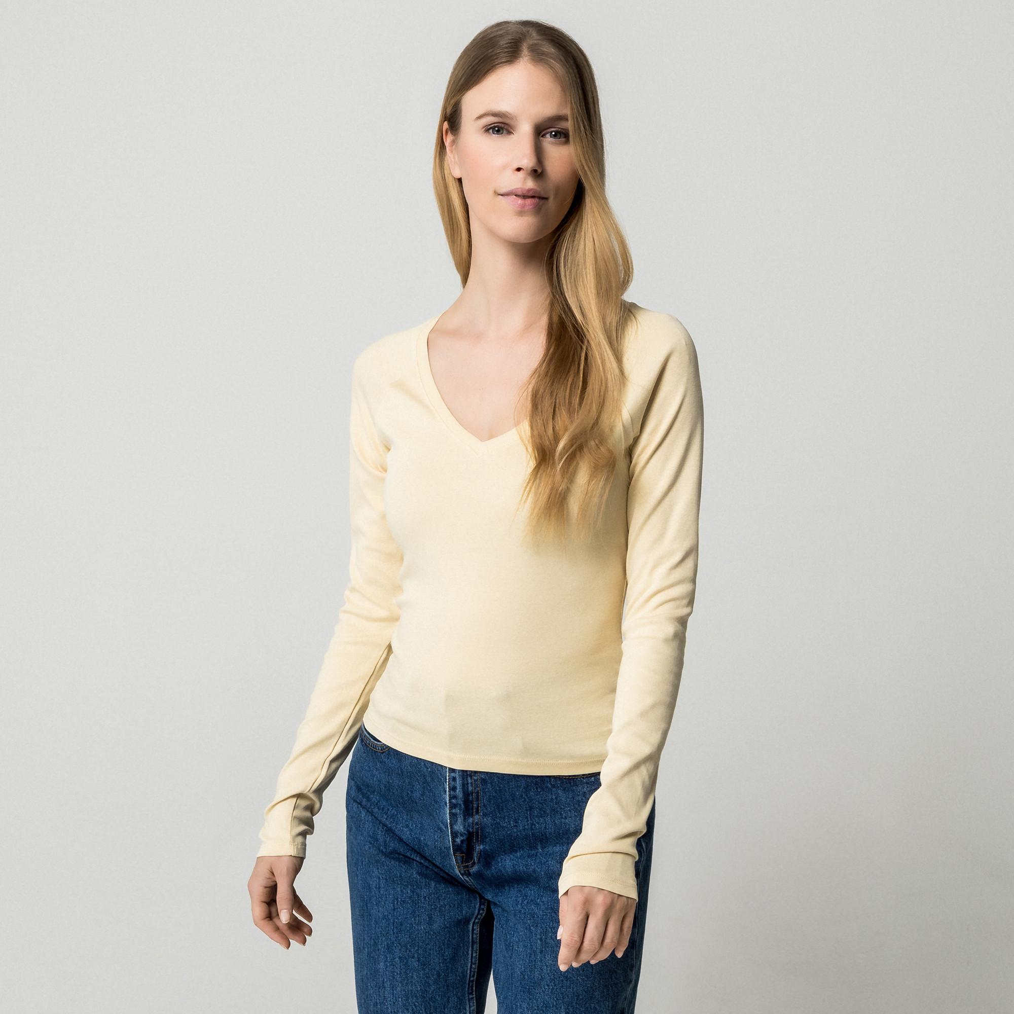 Dieses Langarm-Top verfügt über einen schmeichelhaften V-Ausschnitt und ist eine vielseitige Ergänzung für jede Garderobe. Sein schlichtes und doch elegantes Design macht es für verschiedene Anlässe geeignet und bietet eine bequeme und stilvolle Option für den Alltag oder zum Layering.