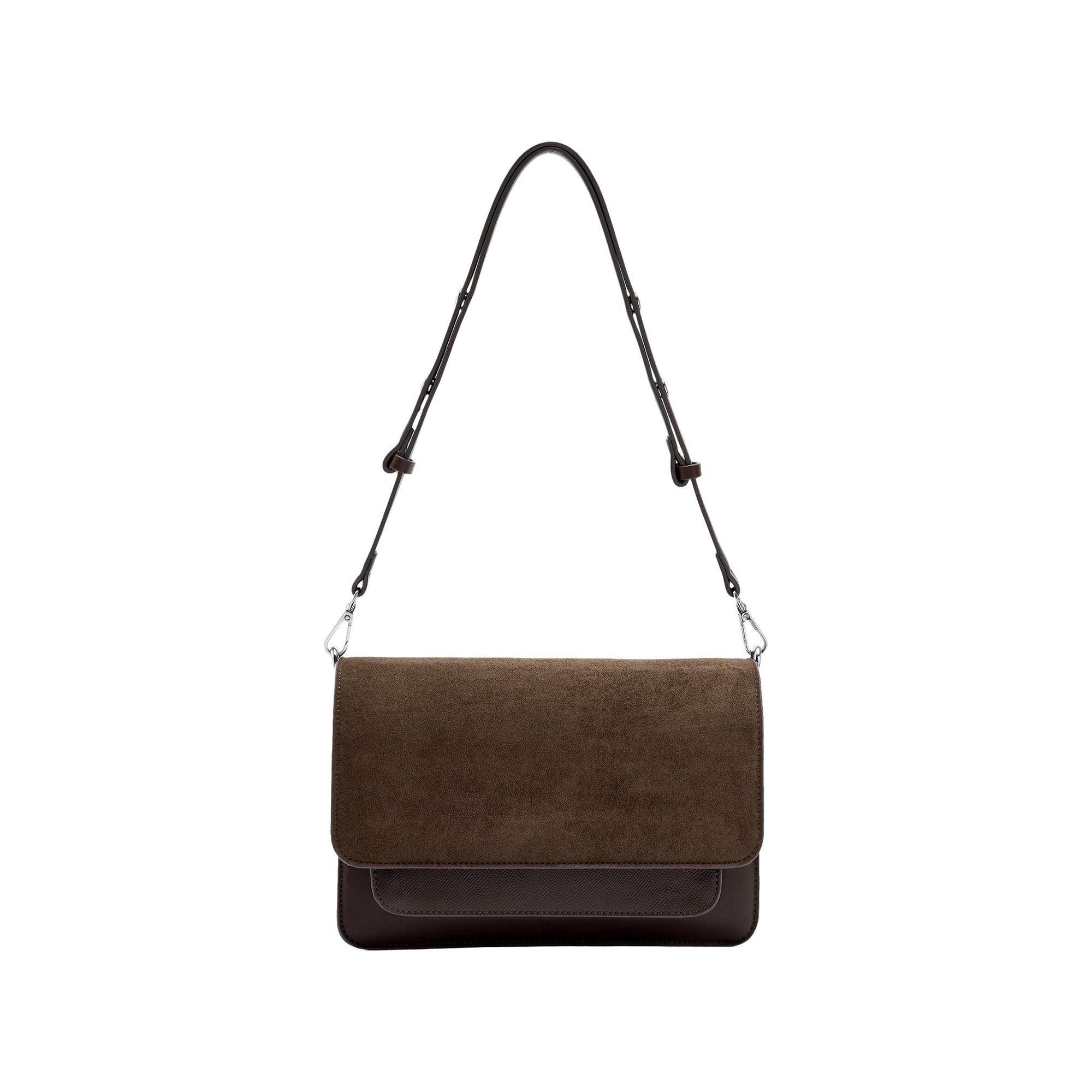 Diese Handtasche bietet ein elegantes und vielseitiges Design, perfekt für verschiedene Anlässe. Sie verfügt über einen Klappenverschluss mit einem strukturierten Detail auf der Vorderseite, das einen subtilen Hauch von Raffinesse verleiht. Die Tasche ist mit einem abnehmbaren und verstellbaren Riemen ausgestattet, der ein bequemes Tragen über der Schulter oder als Umhängetasche ermöglicht.