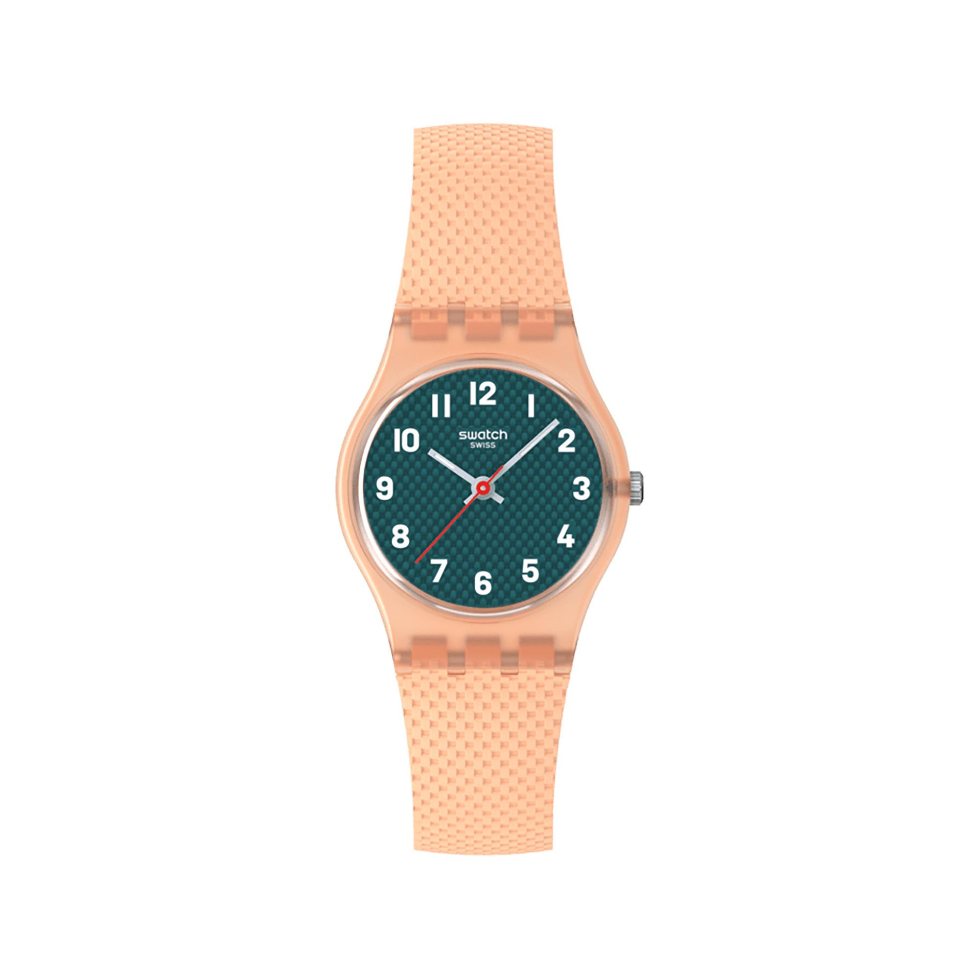 Diese Uhr überzeugt mit einem strukturierten dunkelgrünen Zifferblatt, weissen Ziffern sowie hellblauen, im Dunkeln leuchtenden Stunden- und Minutenzeigern, ergänzt durch einen roten Sekundenzeiger. Das matt-transparent hellorange Gehäuse mit passender Schlaufe, Schliesse und strukturiertem Armband verleiht dem Modell einen frischen, ausdrucksstarken Charakter.