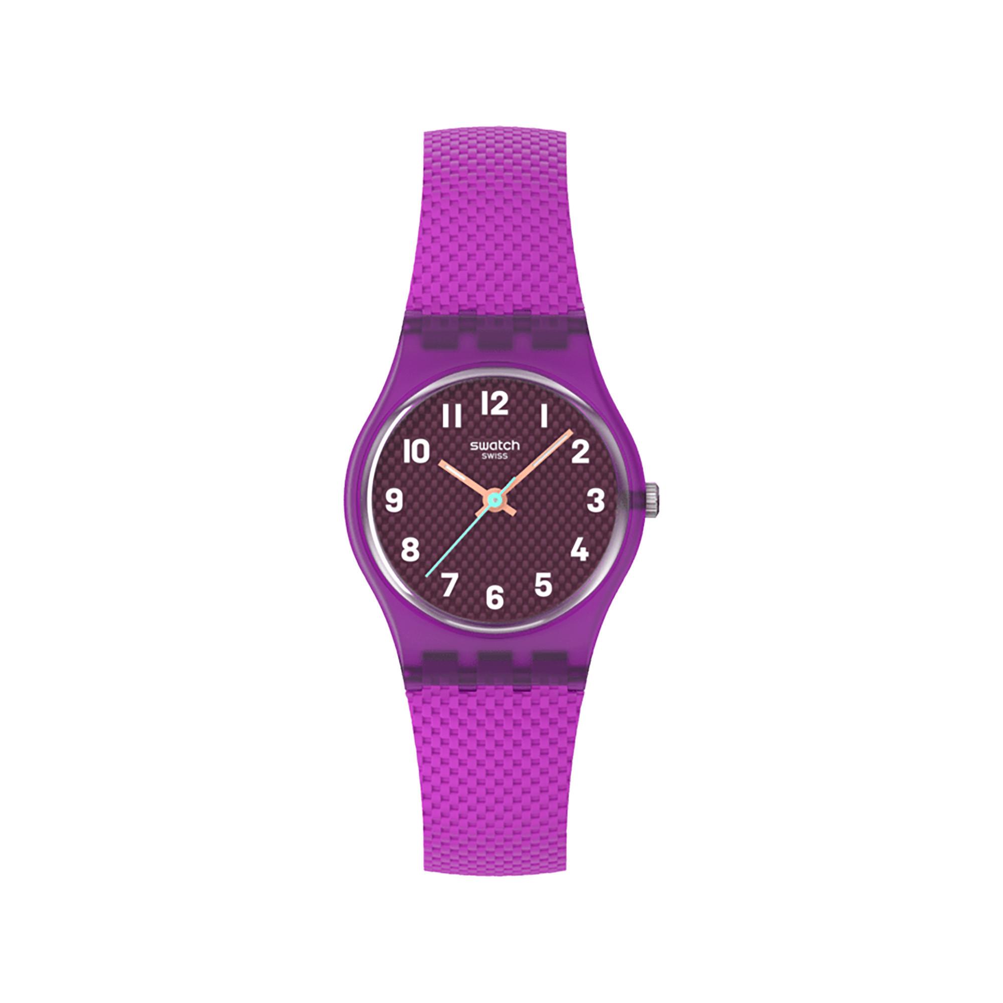 Diese Uhr überzeugt mit einem strukturierten braunen Zifferblatt, weissen Ziffern sowie hellorangen, im Dunkeln leuchtenden Stunden- und Minutenzeigern, ergänzt durch einen hellgrünen Sekundenzeiger. Das matt-transparent violette Gehäuse mit passender Schlaufe, Schliesse und strukturiertem Armband verleiht dem Modell einen modernen und ausdrucksstarken Look.