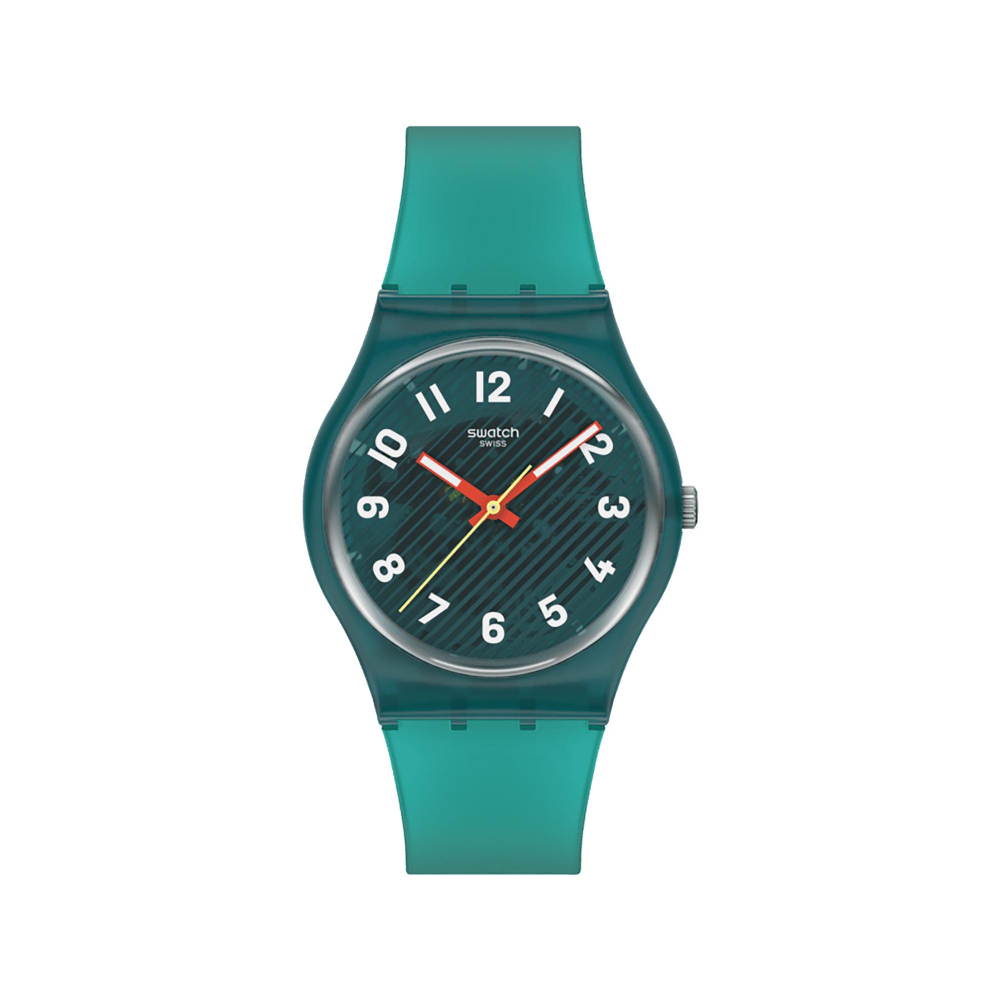 Diese Uhr überzeugt mit einem transparent-dunkelgrünen Zifferblatt mit dunkelgrünen Streifen und weissen Ziffern sowie orangefarbenen, im Dunkeln leuchtenden Stunden- und Minutenzeigern und einem gelben Sekundenzeiger. Das biobasierte Glas und das biobasierte Gehäuse in matt-transparentem Dunkelgrün mit passender Schlaufe, Schliesse und Armband verleihen dem Modell einen modernen und nachhaltigen Charakter.