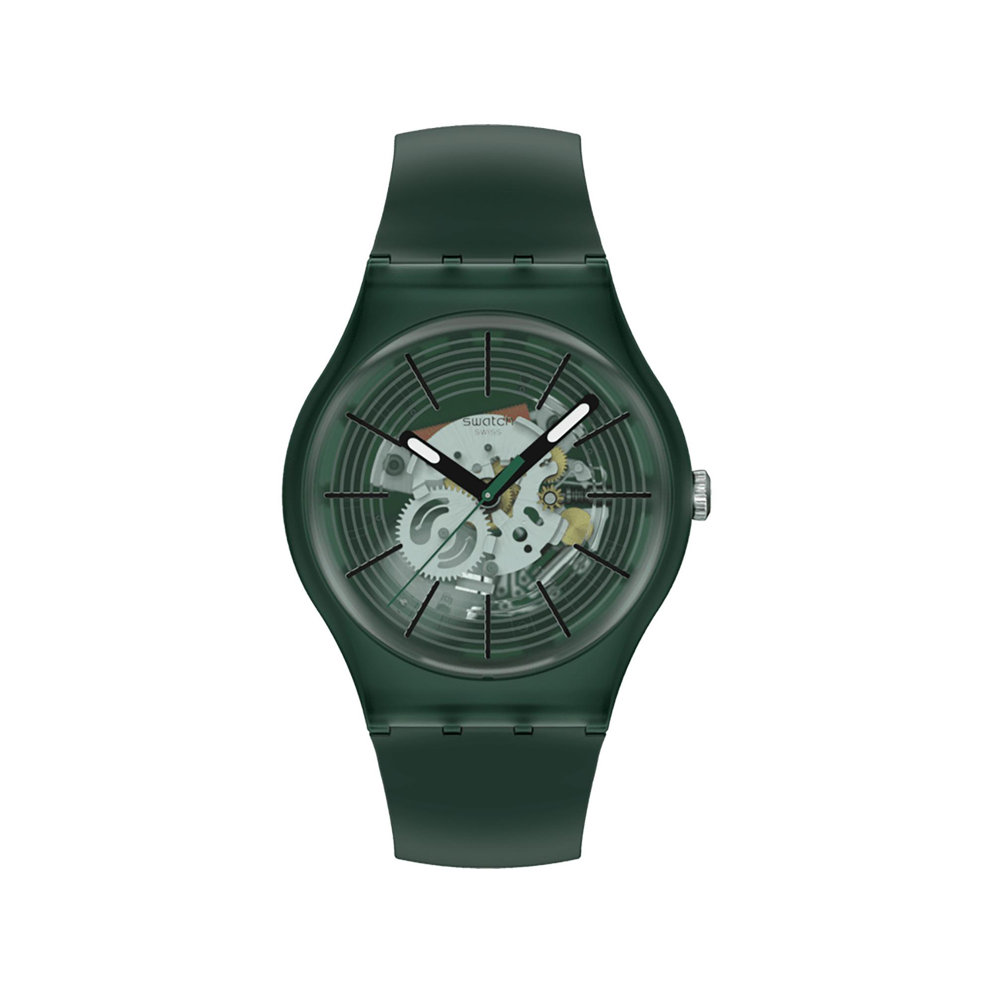 Diese Uhr überzeugt mit einem transparent-dunkelgrünen Zifferblatt mit dunkelgrünen Ringen, schwarzen Stundenmarkierungen sowie schwarzen, im Dunkeln leuchtenden Stunden- und Minutenzeigern und einem dunkelgrünen Sekundenzeiger. Das biobasierte Gehäuse in matt-transparentem Dunkelgrün mit passender Schlaufe, Schliesse, Armband und biobasiertem Glas verleiht dem Modell einen modernen und nachhaltigen Charakter.