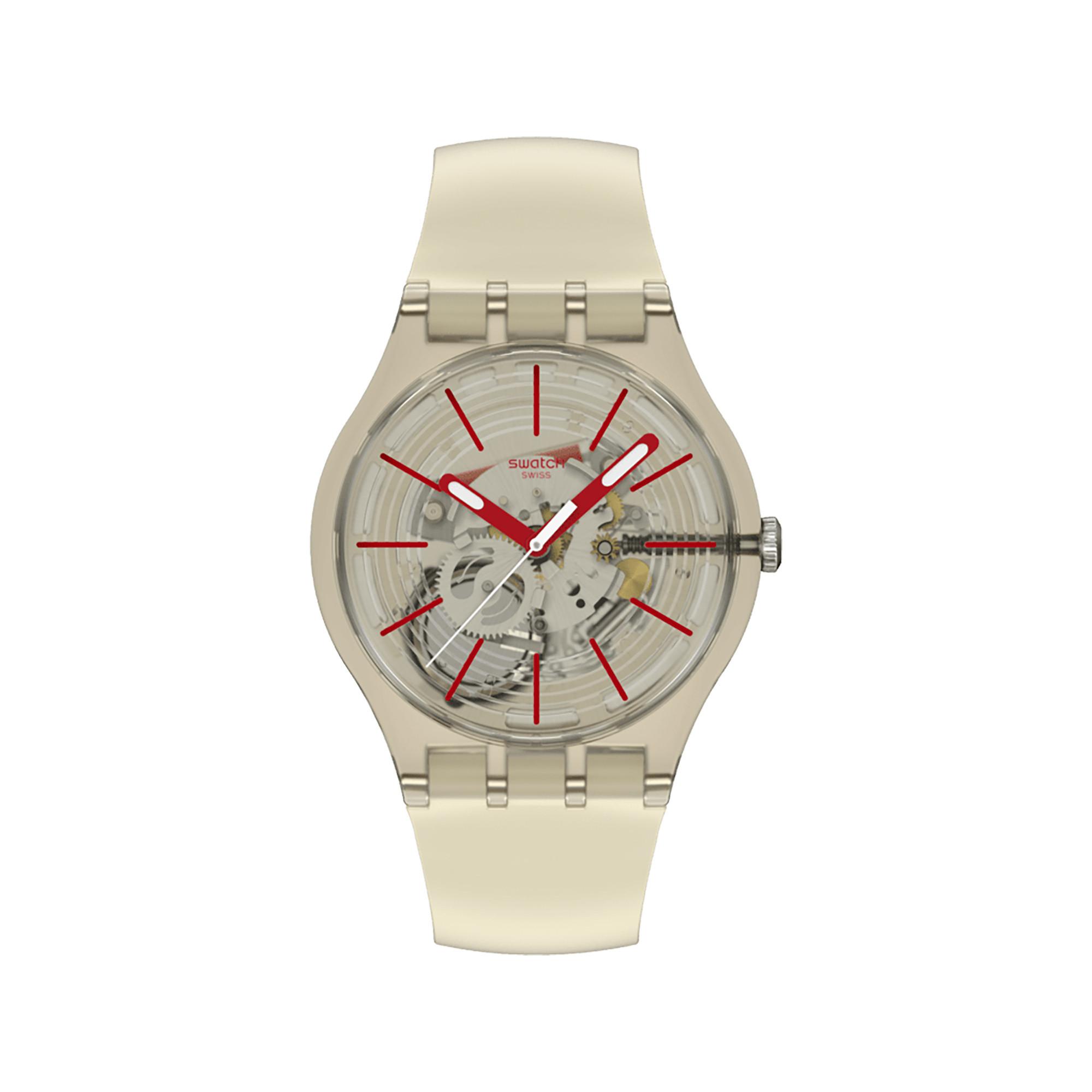 Diese Uhr überzeugt mit einem transparent-beigen Zifferblatt mit beigen Ringen, roten Stundenmarkierungen sowie roten, im Dunkeln leuchtenden Stunden- und Minutenzeigern und einem weissen Sekundenzeiger. Das biobasierte Gehäuse in matt-transparentem Beige mit passender Schlaufe, Schliesse, Armband und biobasiertem Glas verleiht dem Modell einen modernen und nachhaltigen Charakter.