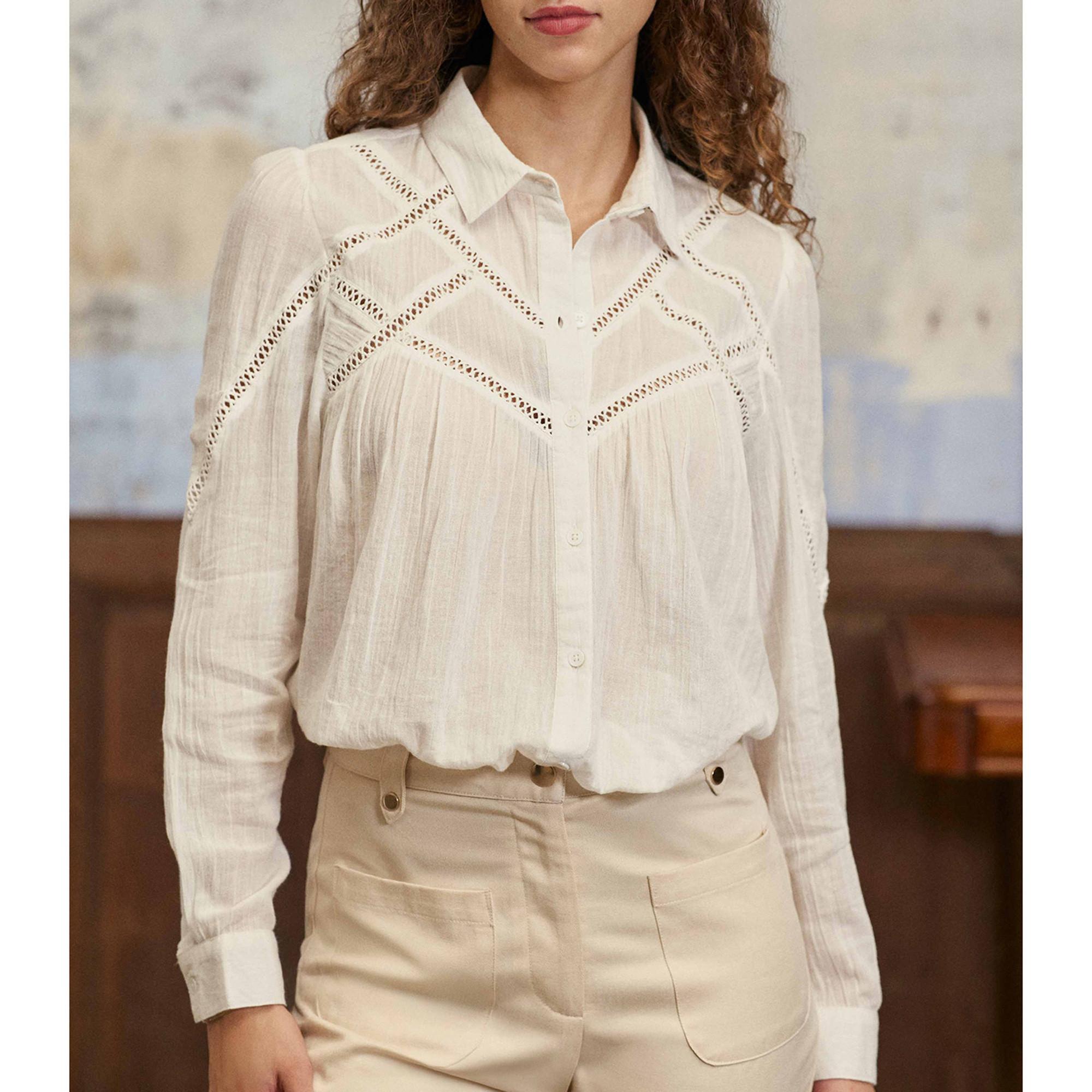 Diese Langarmbluse verfügt über zarte Spitzendetails auf der Vorder- und Rückseite, die dem Design einen Hauch von Eleganz verleihen. Der klassische Kragen und die durchgehende Knopfleiste sorgen für einen zeitlosen Look und machen sie zu einer vielseitigen Ergänzung für jede Garderobe.