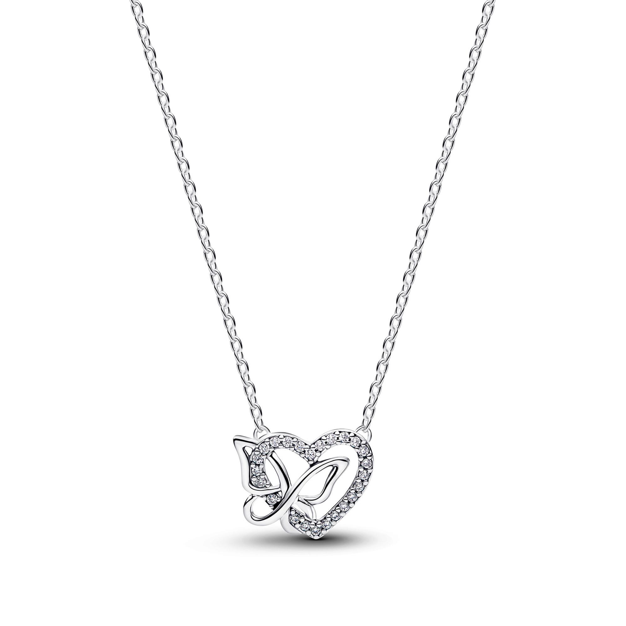 Die offen gearbeitete Halskette aus Sterling-Silber vereint ein Herz mit einem filigranen Schmetterling und funkelnden Steinen. Ein bezauberndes Schmuckstück, das an die enge Verbindung von Liebe und Natur erinnert.
