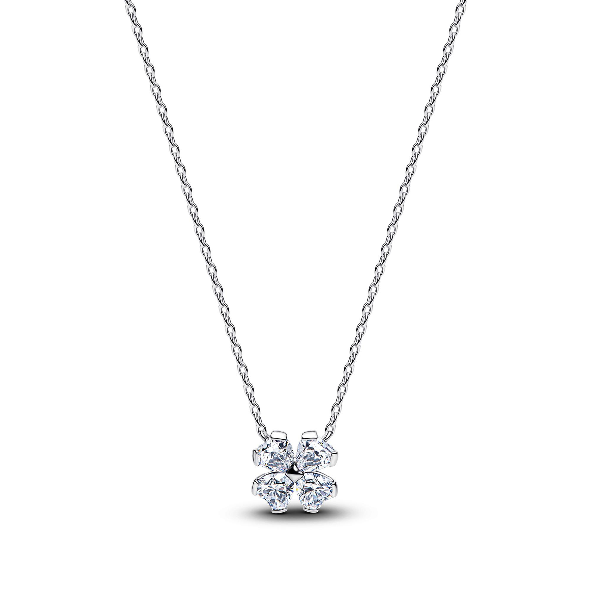 Die Sterling-Silber-Anhänger-Halskette besticht mit einem Kleeblatt aus funkelnden herzförmigen Steinen. Ein charmantes Schmuckstück, das jedem Look einen natürlichen, glücksbringenden Akzent verleiht.